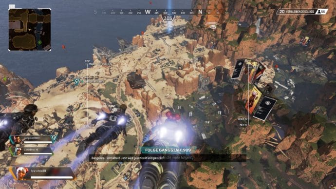 In Apex Legends starten 60 Spieler aufgeteilt in 20 Teams in die Partie. Zu Beginn einer jeden Runde wählt das Team nacheinander einen Helden für das kommende Match. Dabei darf jedoch kein Charakter doppelt in das 3er-Team gewählt werden. Danach geht es auch schon los. Anders als in anderen Ablegern springt ein Team immer gemeinsam aus dem sogenannten Dropship. Der Jumpmaster der jeweiligen Runde kann also den Ort wählen an dem gelandet wird und das gesamte Squad fliegt mit in die jeweilige Richtung. Natürlich kann man sich per Tastendruck auch von den Kollegen lösen, allerdings ist dies durch die enorme Wichtigkeit des Teamspiels nur in seltenen Fällen oder erst kurz vor der Landung ratsam. Einsteiger mit noch etwas weniger Erfahrung können diese Rolle auch an die Teamkollegen weitergeben.