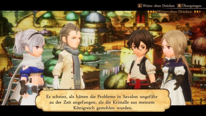 Allgemein bleibt Bravely Default II optisch seinen beiden Vorgängern treu, nutzt aber natürlich die Möglichkeiten der Nintendo Switch aus, was grafisch mehr als deutlich auffällt. So bekommt ihr eine tolle Umgebung mit niedlichen Charakteren, die im japanischen Chibi-Look gehalten sind. Teilweise wirken die Figuren, die ihr aus der Vogelperspektive verfolgt, an manchen Stellen aber zu klein, was der jeweiligen Perspektive geschuldet ist. Die Kämpfe selbst setzen auf eine andere Ansicht, die mit der Berührung von Gegnern sofort angewandt wird. Hier sind die Helden deutlich erkennbar und das Kampfgeschehen bleibt jederzeit übersichtlich. Um die relativ offene Welt weitere Authentizität zu geben, ist ein Tag- und Nachtzyklus implementiert worden. Inwieweit dieser Einfluss auf das Spielerlebnis nimmt, wird wohl erst in der Vollversion beantwortet.