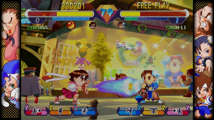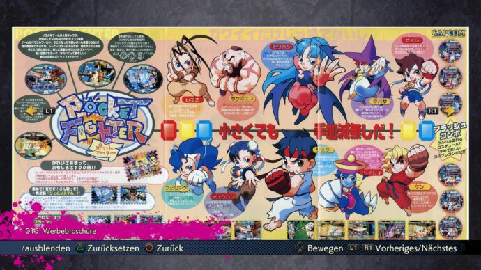 Sehr glücklich bin ich über die Integration von Super Gem Fighter Minimix und Super Puzzle Fighter II Turbo. Ersteres ist ein absoluter Spaßgarant und eine herrliche Verbeugung vor der Firmengeschichte. In dem Spiel treffen Figuren aus Street Fighter und Darkstalkers aufeinander, die Sprites sind als knuddelige Chibis angelegt und besitzen eine Vielzahl an anspruchsvollen Animationsphasen. Richtig toll sind die Special-Moves, in denen Referenzen Noch und Nöcher an andere Franchise gezogen werden. Chun-Li etwa besitzt ein Manöver, in welchem sie sich kurzerhand in das Outfit von Jill Valentine schmeißt und mit Pistole und Raketenwerfer angreift. Die Attacken der einzelnen Figuren funktionieren grundlegend wie in den jeweiligen Spielen, aus denen sie stammen, allerdings kann man bestimmte Angriffe erst ausführen, wenn man eine bestimmte Anzahl an Orbs eingesammelt hat und den jeweiligen Angriff aufgeladen hat.