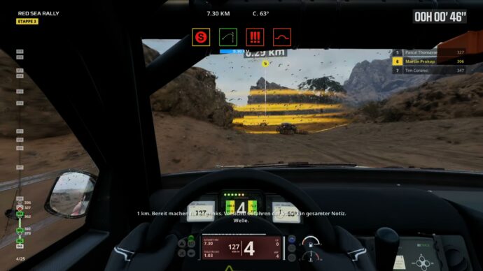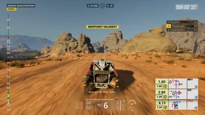 Einsteiger werden sich sowieso erst einmal schwer tun mit dem Roadbook. Auch wenn es eine kurze Einführung in die Navigation über das Streckenbuch gibt, so ist das Fahren am Ende auf der Strecke recht anspruchsvoll. Gleichzeitig sind die Anweisungen des Beifahrers noch so unpräzise, dass wir die Orientierungspunkte auf der Strecke nicht gleich auf Anhieb finden. In der Wüste dienen uns beispielsweise Felsformationen als Anhaltspunkt für den korrekten Weg zum nächsten Checkpoint.