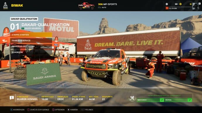 Das große Herzstück und Mittelpunkt von Dakar Desert Rally dürfte mit großer Sicherheit der Karrieremodus sein. Zu Beginn haben wir dort die Wahl aus einem umfangreichen Fahrzeug-Pool. Neben den klassischen Rally-Wagen stehen uns auch noch LKWs, Motorräder, Quads und Wüstenbuggys zur Verfügung. Die Boliden entstammen den vergangenen Saisons 2020-2022 und besitzen dementsprechend die originalen Lackierungen und die Fahrer der jeweiligen Jahre. Sogar den Formel 1 Piloten Fernando Alonso, der 2020 an der Rally teilnahm, könnt ihr auf der Strecke antreffen. Dies sorgt für eine besonders authentische Atmosphäre.