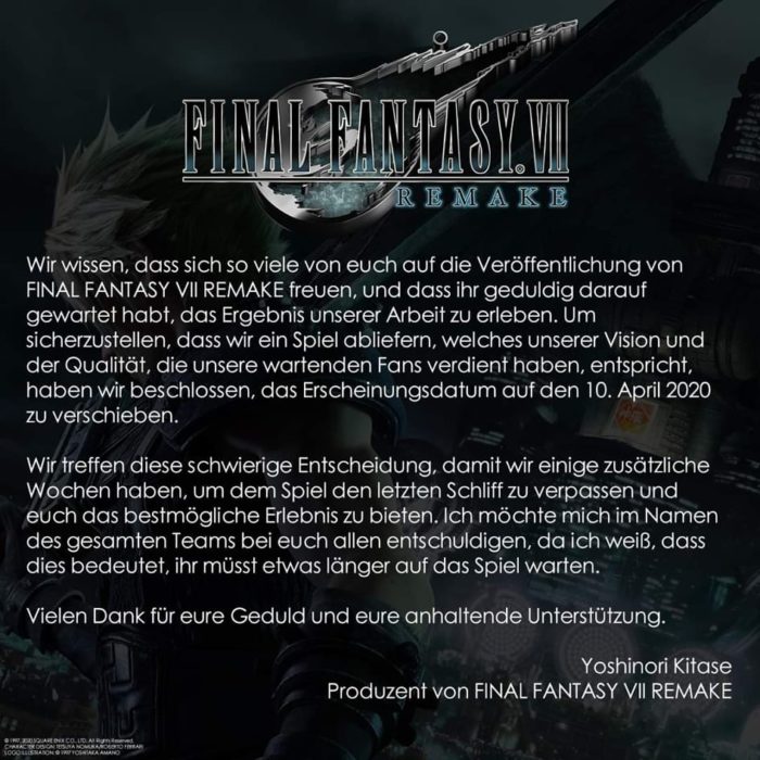 Es wäre zu schön gewesen, wenn der Release vom Final Fantasy VII Remake eingehalten worden wäre, doch leider ist an dem nicht. Am Nachmittag wurde eine Meldung von Square Enix veröffentlicht, bei der der Publisher eine Verschiebung benannte. Statt der 3. März 2020 ist nun der 10. April 2020 benannt. Die Originalmeldung zur Verschiebung vom Final Fantasy VII Remake könnt ihr gleich hier lesen. Kurz und knapp gesagt, der Grund ist die Gewährleistung der Qualität des Rollenspiels.
