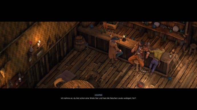 Obwohl im Titel eine Drei steht, handelt es sich beim neuen Desperados nicht um eine Fortsetzung, sondern um ein Prequel. Mit John Cooper, Doc McCoy und Kate O’Hara kehren drei zentrale Figuren aus den bei Spellbound Entertainment entstandenen Vorgängern zurück. Gemeinsam mit Hector und Isabelle, den beiden Neuen im Bund, formiert sich die Gang und erlebt typische Wild West Abenteuer, die mal mehr, mal weniger bekannte Klischees bedienen. Die quer durch die USA stattfindende Handlung, in der man sich gegen die Machenschaften der DeVitt Company stellt, ist nicht weiter erwähnenswert. Sehr wohl der Rede ist hingegen die unterhaltsame Interaktion zwischen den fünf Hauptfiguren. Diese haben nicht nur alle einen angenehm ausgearbeiteten Charakter, sondern stets auch etwas Interessantes zu sagen. Egal ob innerhalb der Missionen oder in den Zwischensequenzen: es macht schlichtweg Spaß Cooper und dem Rest zuzuhören, was nicht zuletzt auch an der tollen deutschen Vertonung liegt, die es ebenso wie die gelungene Dialogregie hervorzuheben gilt.