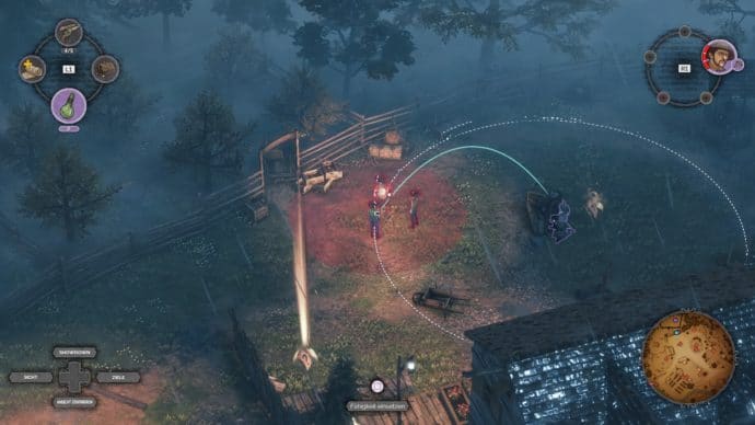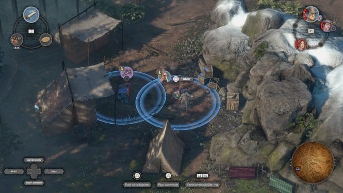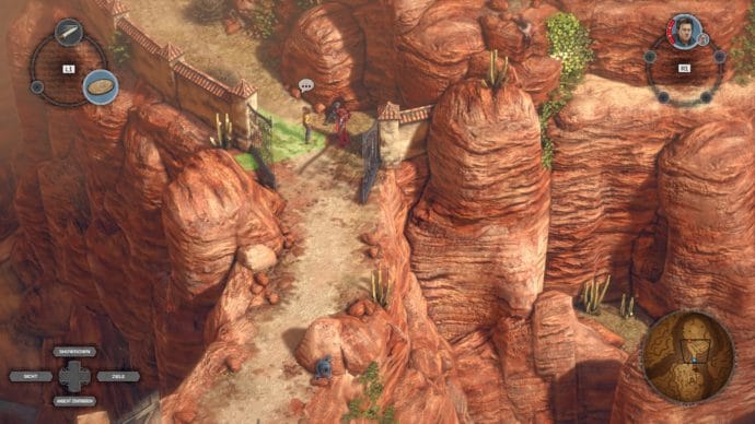 Um dies zu bewerkstelligen, sollte man sich früh mit dem Showdown-Modus vertraut machen. In diesem kann man die Zeit pausieren und Aktionen Schritt für Schritt planen. Das ist gerade dann praktisch, wenn man mehrere Ziele auf einmal ausschalten will. Schon auf dem normalen Schwierigkeitsgrad neigt Desperados III nämlich dazu einigermaßen knackig zu sein und auf den ersten Blick schier unlösbare Hürden in den Weg zu stellen. Es lohnt sich von daher sich zu Beginn einer neuen Karte mit der Umgebung vertraut zu machen. Nicht nur kann man immer mal wieder lockere Felsen und andere schwere Lasten auf Feinde stoßen, auch hinterlässt man in Schlamm Fußspuren und kann Gegner so auf eine falsche Fährte oder in eine Falle locken.