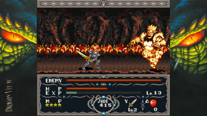 Der 2D-Perspektive liegt in erster Linie das Kampfsystem zu Grunde, denn wie bereits gesagt, spielt sich Dragon View wie ein Brawler, also so ein Spiel wie Legend oder Turtles in Time. Man verdrischt die Gegner also in Form eines actionreichen Beat‘ em Ups. Hierfür stehen Alex in erster Linie zwei Waffen zur Verfügung. Das klassische Schwert für den Nahkampf und das „Hauza,“ eine Art Bumerang-Waffe für den Fernkampf. Im späteren Spielverlauf erbeutet man auch noch Pfeil und Bogen (aufgrund des Hauza absolut witzlos), sowie drei magische Ringe, mit denen man Zauber der Elemente Feuer, Eis und Blitz lostreten kann. Die primären Kampfvarianten bleiben jedoch das Schwert und das Hauza. Die Levelstrukturen der Dungeons sind übrigens komplexer, als man annehmen mag, denn die linearen Gänge zweigen gerne in Wege nach oben, unten, links und rechts ab. Es gibt sogar verschiedene Ebenen innerhalb vieler Dungeons, die durch Treppen oder Löcher im Boden erreicht werden können. Wer die Dungeons unterschätzt, kann sich leicht verlaufen. Manchmal lohnt es sich sogar seine eigene Karte zu zeichnen.