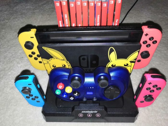 Die mattschwarze Ladestation von Snakebyte trägt nicht grundlos das Wort „Base“ in seiner Bezeichnung. Denn neben dem Aufladen von Steuerungselementen, werden Möglichkeiten der Unterbringung von Konsole und Games vereint. Zuallererst möchte ich aber auf das hauptsächliche Feature eingehen. Die Dual Charge:Base S ermöglicht es nämlich, zwei Joy-Cons sowie einen Controller gleichzeitig mit frischer Energie zu vorsorgen.