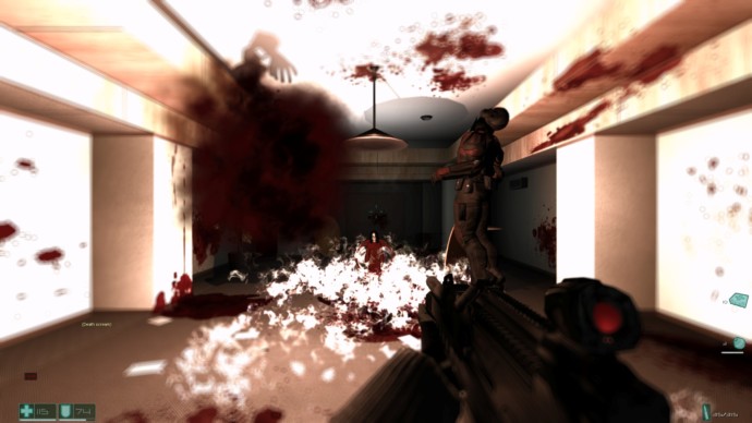 Clinic ist eigentlich nur ein regulärer Level. Beim Arena-Level handelt es sich, wie der Name schon suggeriert, um eine kleine Arenafläche, wo man mehrere Gegnerwellen eliminieren bzw. überleben muss. Zwischen den Wellen wird immerhin Ausrüstung in eine der vier Arena-Ecken „gebeamt.“ Zu guter Letzt wäre da dann noch Sprint. Hier muss man sich durch einen äußerst linear strukturierten Levelabschnitt kämpfen, welcher zwar keine Medipacks beinhaltet, dafür aber hin und wieder Booster springen lässt, die ja die komplette Lebensenergie regenerieren.