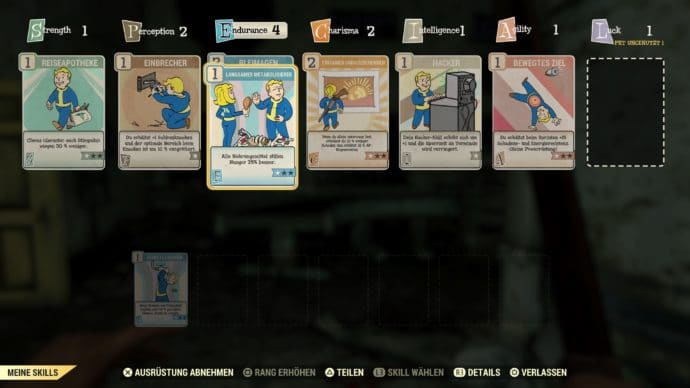 Natürlich sammelt ihr wie für ein Rollenspiel typisch auch zahlreiche Erfahrungspunkte auf eurem Weg durch das Ödland. Doch anders als man es bereits gewohnt ist, erhaltet ihr durch Levelaufstiege diverse Sammelkarten, die euch bestimmte Perks liefern. So könnt ihr für euren Stärke-Slot beispielsweise die Fähigkeit erhalten mehr Schaden mit euren Nahkampfwaffen auszuteilen oder mehr Gewicht zu tragen. Dies wird besonders interessant wenn ihr euch im Team abstimmt und jeder eine für das Team vorteilhafte Richtung einschlägt.