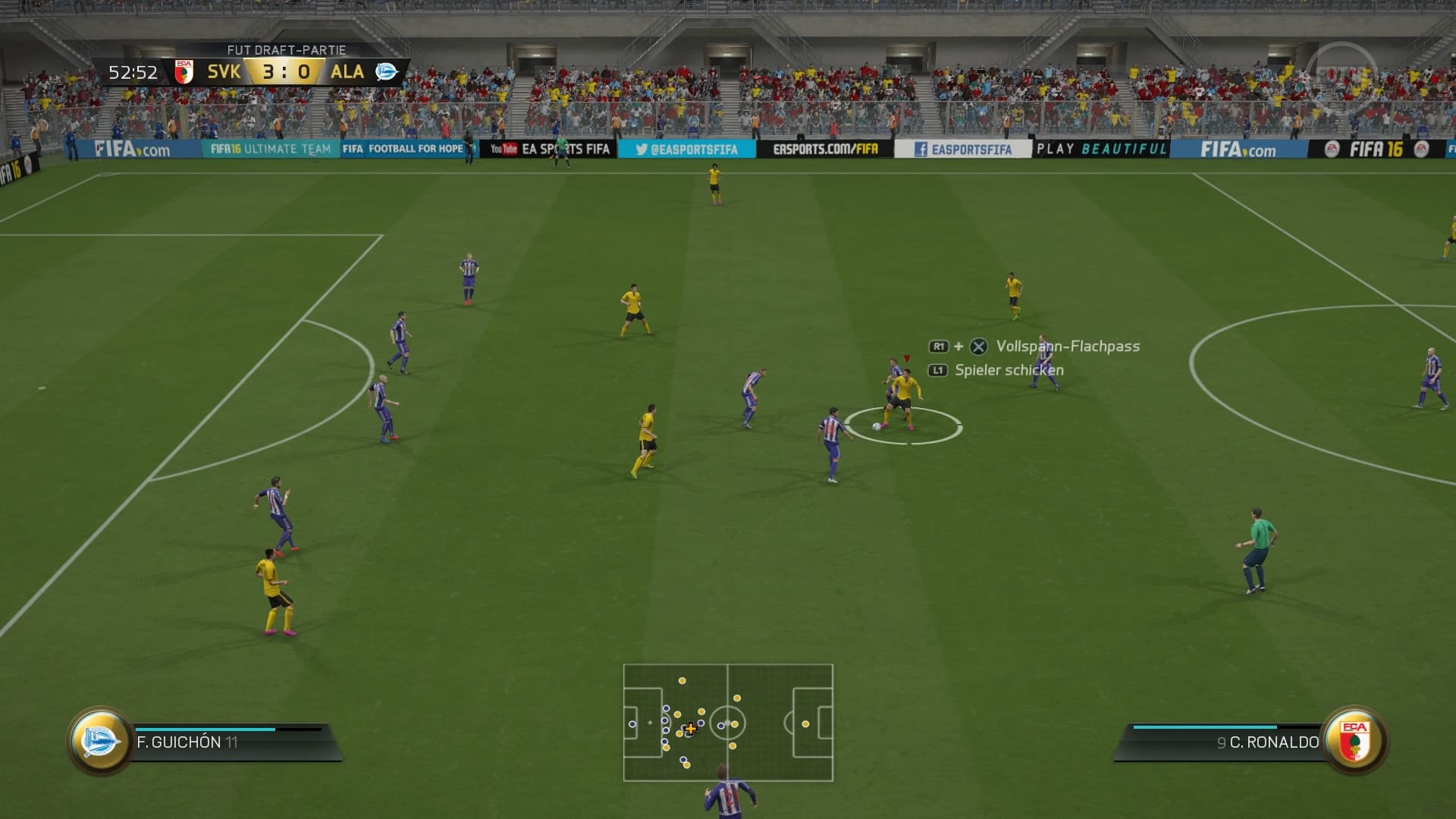 Zum ersten Mal in Fifa 16 ist nun der sogenannte Draft-Modus enthalten, indem wir für eine Gebühr von 15.000 Münzen, 300 Fifa-Coins (umgerechnet rund 3 €) oder für ein Draft-Token, welchen wir mit etwas Glück in einem der Packs erhalten können, teilnehmen dürfen – das erste Mal ist noch kostenlos. Nach dem Start des Modus wählen wir einen Kapitän, und bauen um diesen herum ein Team aus absoluten Superstars aus den europäischen Ligen. Aber auch hier gilt: Immer auf die Teamchemie achten, welche wir durch Gemeinsamkeiten wie dieselbe Liga, oder gleiche Nationalität zweier Spieler, erhöhen. Wir haben auf jeder Position immer die Wahl eine aus fünf vorgeschlagenen Karten zu wählen, um damit unser Team nach und nach zu füllen.