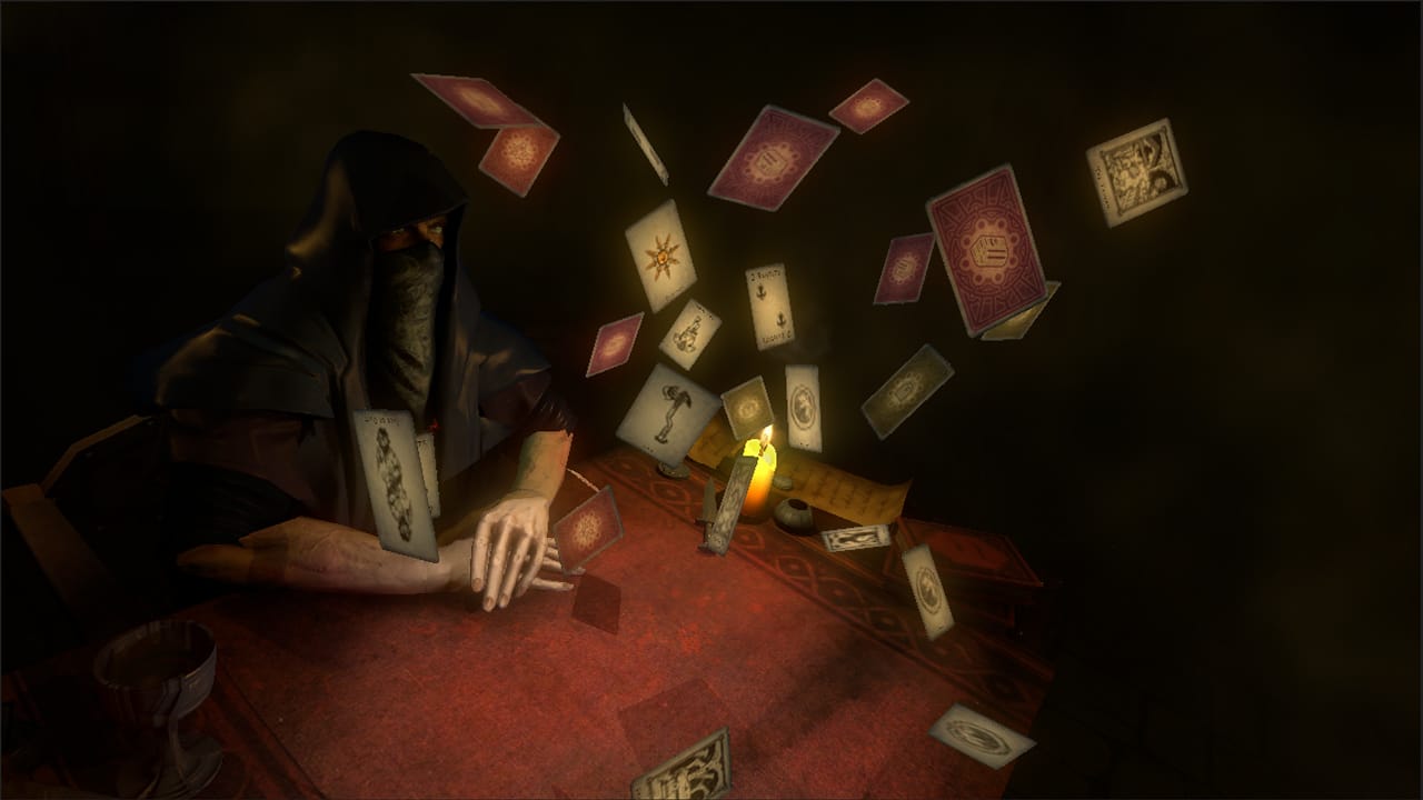Wir befinden uns in einem dunklen Raum, in dessen Mitte ein Tisch verziert mit Kerzen steht. An diesem Tisch sitzt ein alter Mann dessen Gesicht weiten teils vermummt ist. Vor dem alten Mann schweben wirr Spielkarten umher. Er bittet uns Platz zunehmen, und nachdem wir dies auch tun, sammeln sich alle umherfliegenden Karten in der Hand des Mannes. Dieser begrüßt uns freundlichen und tut so als ob er gewusst hat, dass wir uns an dieser Stelle platzieren würden. Zugleich fragt er uns, ob wir ein neues Abenteuer bestreiten möchten.