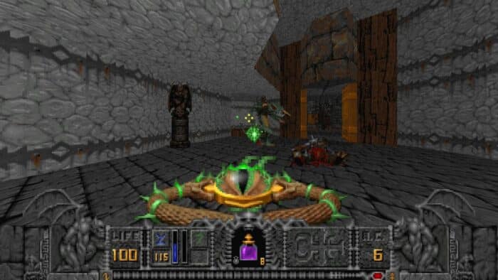 Gerade Heretic hat es mir ziemlich angetan. Die D&D-Wurzeln der Mitverantwortlichen sind klar in dieser dunklen Version eines Fantasy-Spiels zu erkennen. Die Level sind stilisierte Mittelalter-Konstruktionen (oder das, was Amerikaner als Mittelalter verstehen). Golems, Gargoyles und Magier werden als Gegner in die Arenen geworfen, einen Blitze verschießenden Handschuh und einen ziemlich unbrauchbaren Stock (ein Zauberstab ohne Funktion?) als Waffen in die virtuellen Hände gelegt. Das Spieltempo ist so hoch wie in Doom (ist ja auch die gleiche Engine). Und ebenso wie im Urknall für das Shooter-Genre wirkenden Spiel von id, so sammelt man auch in Heretic Schlüssel und legt Schalter um, um ins nächste Areal zu gelangen. Zusätzlich sammelt man Items ein, die man aus einem auch im Remaster nicht unbedingt zugänglichen Menü heraus einsetzt. Oftmals übersehen wird eine zweite Premiere für das Genre, denn Raven hat quasi den zweiten Feuermodus in Shooter eingeführt. Dieser ist aber lediglich in Form eines Items verfügbar und nur für kurze Zeit, richtet aber ungemein großen Schaden an.
