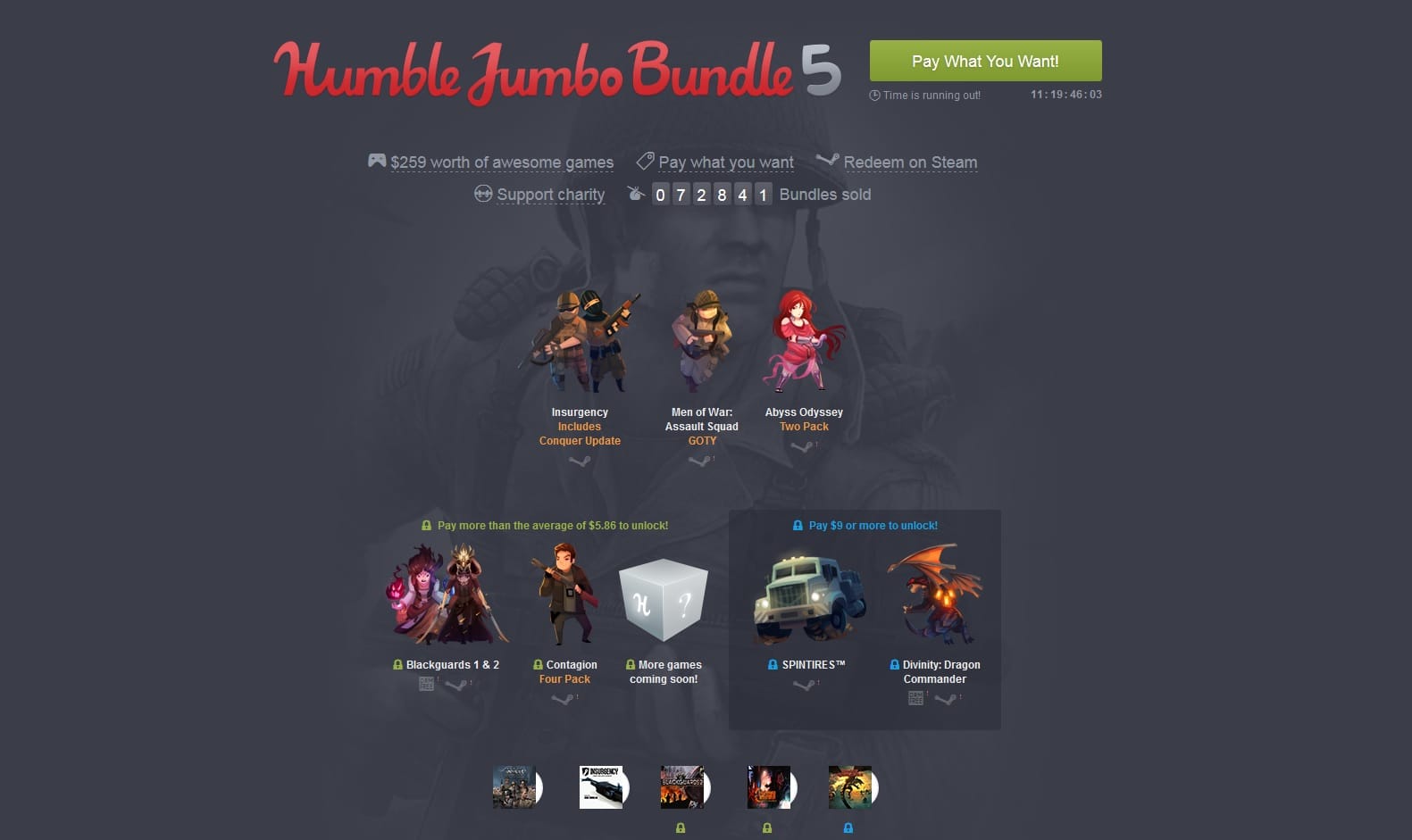 Das nächste große Humble Bundle wurde vor Kurzem veröffentlicht. Auch dieses Mal hat sich das Humble-Team mit dem Humble Jumbo Bundle 5 etwas ganz Besonderes für euch einfallen lassen. Für einen relativ günstigen Preis erhaltet ihr ein prall gefülltes Paket voller Games und unterstützt nebenbei noch eine wohltätige Organisation wie das Amerikanische Rote Kreuz oder GamesAid. Begeisterte Hobby-Strategen werden sich besonders über das Taktik-RPG Blackguards und dessen Fortsetzung freuen. Zombiejäger hingegen haben in Contagion mit bis zu vier Freunden ihren Spaß. Als besonderes Extra warten im aktuellen Humble Bundle Soundtracks der enthaltenen Games. Das steckt im Humble Jumbo Bundle 5:
