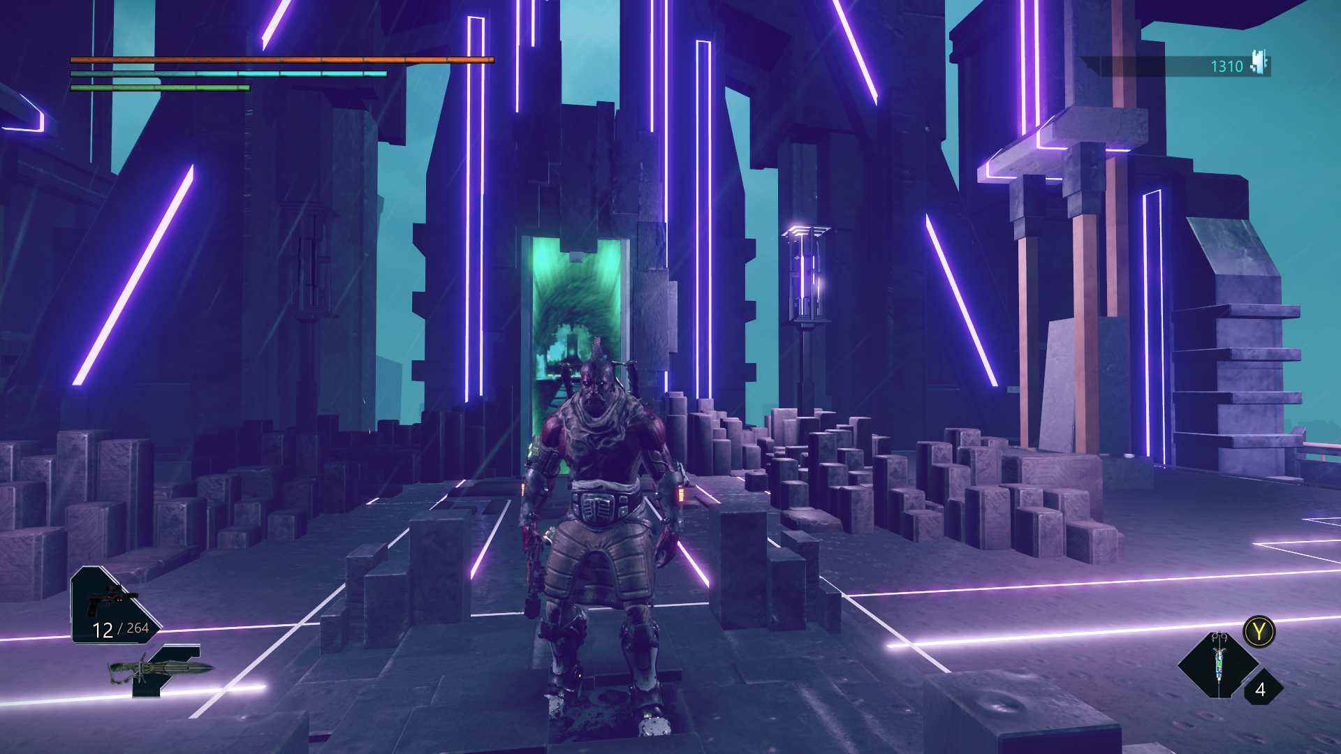 Vom Kern aus gelangt unser Held über Portale auf diverse, umliegende Planeten. Diese unterscheiden sich in ihrer Beschaffenheit teils stark. Von vereisten Einöden, über wuchernde Dschungellandschaften, bis hin zu düsteren, von Neonfarben erleuchteten Steinkomplexen. Hier richten sich die Entwickler in erster Linie an alle SciFi-Fans, die sich schon immer ein futuristisches Dark Souls gewünscht haben. Abwechslung ist also vorhanden, wenn der Aufbau der einzelnen Areale auch recht linear ist. Leider hat man sich an manchen Stellen zu stark am Vorbild orientiert, weshalb zum Beispiel die Spielwelt nur spärlich mit NPC’s bevölkert wurde, die allesamt vor kryptischen Dialogen nur so strotzen.