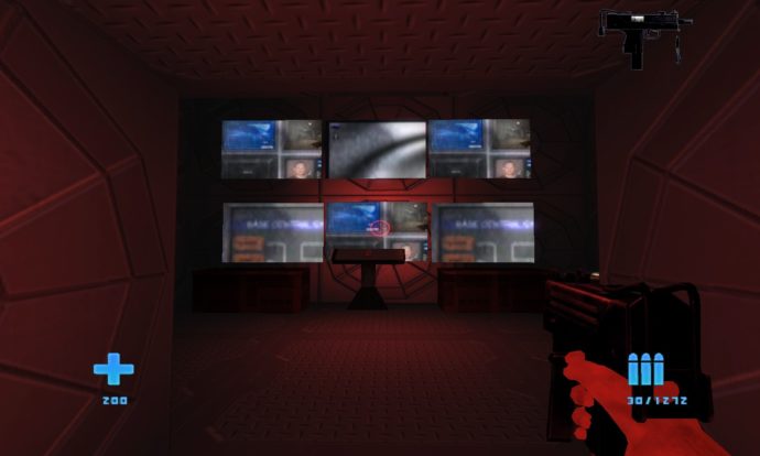 Nachdem man also den ersten Level hinter sich gebracht hat, der nur der Einführung dient, und in dem noch nicht gekämpft wird, geht es auch endlich mit der Ballerei gegen eine grundsätzlich überschaubare Anzahl von Gegnern los. Mit sieben verschiedenen Waffentypen, die man freilich erst nach und nach zusammenklaubt, kämpft man sich durch die unterschiedlichen und größtenteils linearen Sektoren der Forschungsanlage. Die Waffenpalette reicht nicht über den Genre-Standard hinaus: Da hätten wir die Metallstange, welche jedoch komplett nutzlos ist, da unsere insgesamt 200 Lebenspunkte im Nahkampf in Sekundenbruchteilen abgezogen werden, die Pistole, die Shotgun, das SMG, das Sturmgewehr, eine Laserpistole und einen eher enttäuschenden Granatwerfer. Die Ballerei funktioniert solide, auch wenn die Reaktionszeit und Trefferquote der Söldner manchmal etwas unfair anmutet. Glücklicherweise wurden ausreichend Medipacks in den Levels verteilt, welche jeweils 50 Lebenspunkte regenerieren. Munition gibt es sogar in Hülle und Fülle. Lediglich der Granatwerfer und die übermächtige Laserpistole sollten sparsam eingesetzt werden.
