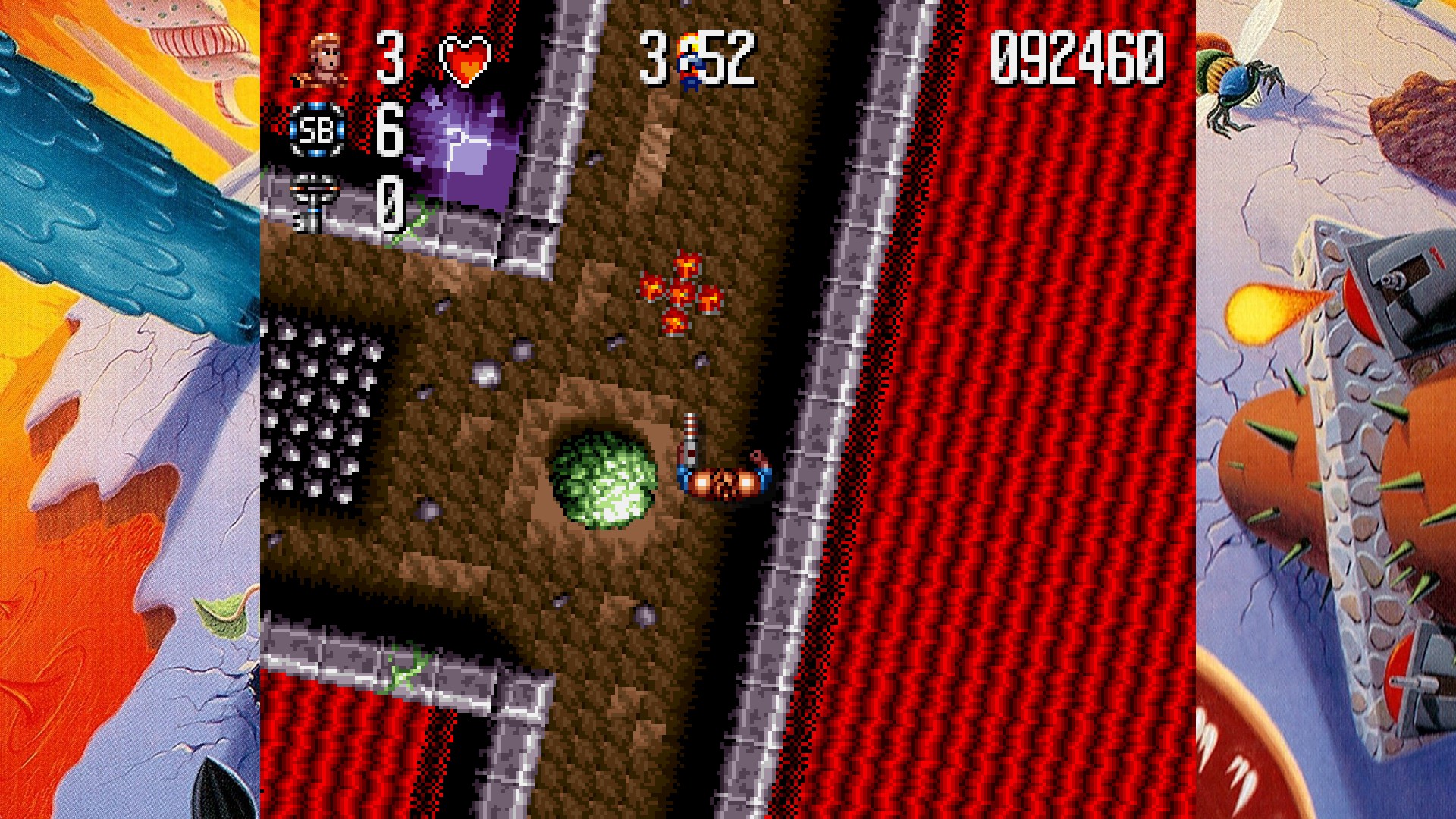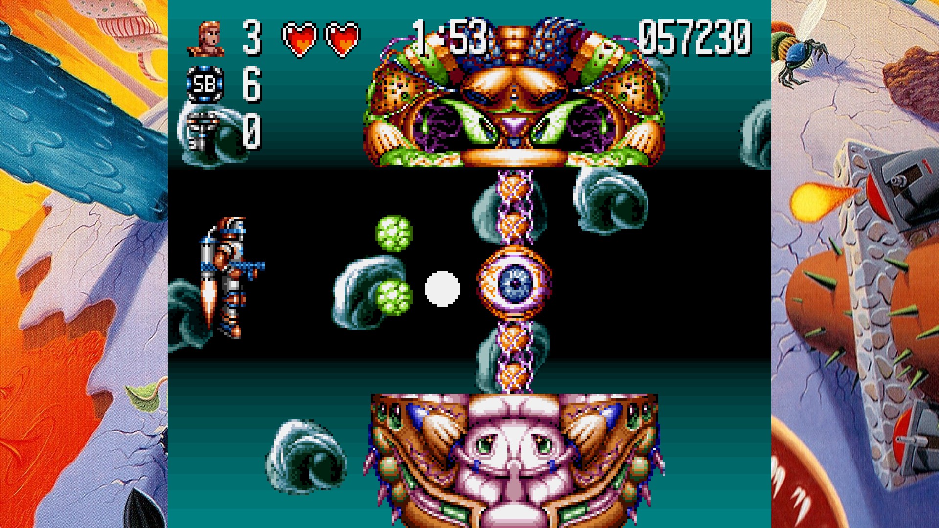 Hat man eines der drei Extraleben verloren, wird man zum letzten, unsichtbaren Checkpoint zurückgesetzt. Checkpoints sind, Gott sei dank, sehr großzügig gesetzt, so dass man in der Regel nur zwei, drei virtuelle Meter zurückteleportiert wird und die verlorene Wegstrecke dank temporärer Unverwundbarkeit leicht wieder einholen, und oftmals sogar noch ein Stück weiter vordringen kann. Das ist aber nur eine kleine Hilfe, die auch nicht verhindert, dass man sich einen abbrechen muss, wenn man auch nur den ersten richtigen Bossgegner zu Gesicht bekommen will. Denn als ob das Spiel nicht so schon schwer genug wäre, gilt es in den Sidescroll-Stages nämlich auch noch Zwischenbosse zu bezwingen. Und anders als in der DOS-Version ist die SNES-version nicht so höflich nen Lebensenergiebalken für die Zwischen- und Endbosse anzuzeigen.