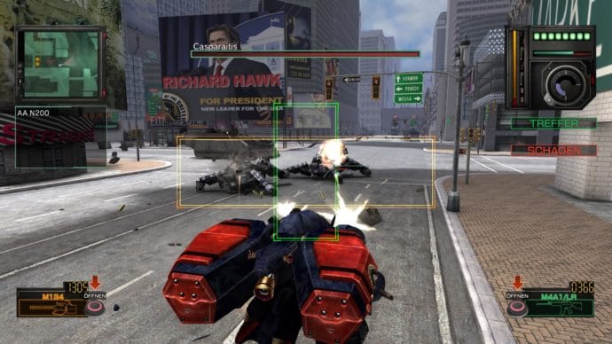 Alleine die Geschichte hinter Metal Wolf Chaos gibt genügend Stoff für einen eigenständigen Beitrag. Mit der Maßgabe der in Japan schwächelnden Xbox unter die Arme zu greifen, sollte FromSoftware ein auf den heimischen Markt zugeschnittenes Mecha-Spiel machen. Erfahrung hatte das Studio auf diesem Gebiet dank der halbwegs bekannten Armored Core Reihe sowieso. Innerhalb von gerade einmal acht Monaten (!!!) wurde das Spiel schließlich fertiggestellt und im Dezember 2004 in Japan veröffentlicht. Ein westlicher Release blieb aber aus und das, obwohl die japanische Version bereits mit einer komplett englischen Sprachausgabe ausgestattet war und lediglich Bildschirmtexte hätten lokalisiert werden müssen. Die Gründe für die ausbleibende Veröffentlichung in Nordamerika und Europa ist nicht wirklich bekannt. Eventuell lag es am Umstand, dass sich die Xbox bereits in ihrem finalen Lebenszyklus befand, vielleicht wollte Microsoft das Spiel aber aus inhaltlichen Gründen nicht auf westlichen Märkten sehen. Denn was hier in Sachen Story abgefeuert wird ist, gelinde gesagt, ziemlich abgedrehter Scheiß auf Hirnfurz-Niveau.