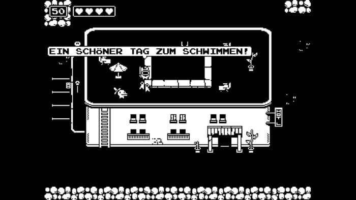 Auch in grafischer Hinsicht setzt Minit auf Minimalismus. Das gesamte Spiel wird lediglich in den Farben Schwarz und Weiß dargestellt und auch die Gestaltung der Sprites ist ziemlich bodenständig. Auffällig ist die abstrakte Gestaltung der Charaktersprites, es ist nicht immer offensichtlich welcher Tierart der jeweilige Furry-NPC nachempfunden ist. Abgesehen vom Endkampf sollte man auch keine grafischen Highlights erwarten. Dementsprechend gibt es auch nicht mehr, was sich zur Grafik sagen lässt. Entweder man mag den speziellen Stil, oder eben nicht.