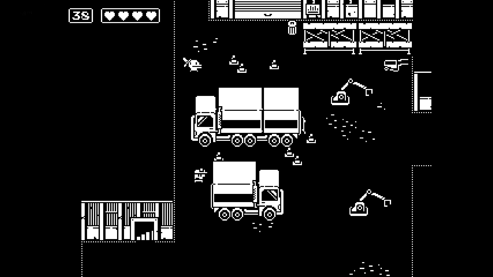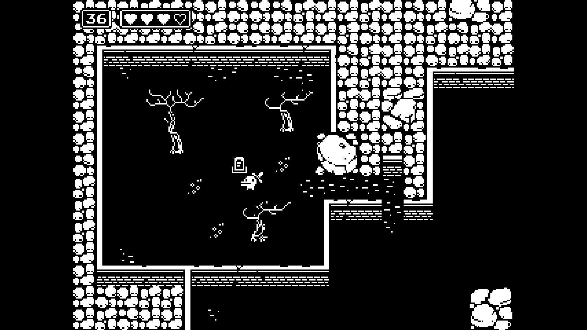 Wie schon bei den Punkten Gameplay und Story, präsentiert sich Minit auch in Sachen Technik eher minimalistisch, was aber überwiegend positiv zu werten ist. Optisch könnte der Indietitel, wie ihr bereits oben lesen konntet, ein Klassiker der 90er Jahre für Nintendos Handheld sein. Grob verpixelte Objekte, sehr rudimentär gezeichnete NPC’s sowie die weiße 2D-Spielwelt vor einem tiefschwarzen Hintergrund. Aus heutiger Sicht würde man sagen, charmant und ressourcensparend. Selbst der Soundtrack ist im Zeichen der „guten, alten Zeit“ gehalten und ruft bei dem einen oder anderen nostalgische Gefühle hervor. Auf eine Sprachausgabe wurde jedoch bis auf ein paar einzelne Laute verzichtet und die Soundkulisse beschränkt sich mit monotonen Soundeffekten auf das Nötigste.