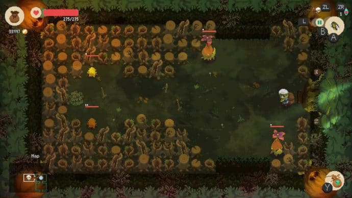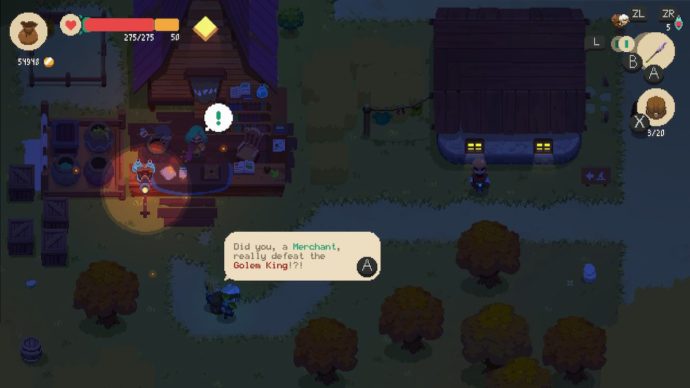 Beginnen wir aber mit dem “Looten”. Um ausreichend Waren für unseren Laden parat zu haben, müssen wir regelmäßig die Dungeons besuchen. Die dort zufallsgenerierten Räume durchforsten wir einen nach dem anderen, kämpfen gegen Monster und plündern Kisten und manchmal auch Skelette anderer, weniger erfolgreicher Helden. Für den Kampf steht der schnelle Wechsel zwischen zwei verschiedenen Waffen zur Verfügung, sowie ein Standardangriff je nach Waffe und ein Hechtsprung. Während wir uns laufend in alle Richtungen bewegen können, stehen uns für Angriffe und Sprünge nur genau die vier Himmelsrichtungen zur Verfügung. Das macht das Kampfsystem manchmal etwas unpräzise, kann aber auch Vorteile bieten. Zum Beispiel wenn wir uns an einen schießenden Gegner so herantasten, dass seine nach vorne gerichteten Schüsse und verfehlen, wir in aber mit einer etwas ausladender schlagenden Waffe treffen können. Und derartige Tricks und Kniffe sind streckenweise auch bitter nötig, denn die Dungeons werden von Ebene zu Ebene immer schwieriger. Insgesamt gibt es drei solcher Ebenen, bevor man zu einem Endgegner gelangt. Doch das geht nicht so schnell, wie es klingt, denn das ist nicht mit einem einzigen Durchlauf gemacht. Nein, vielmehr müssen wir wieder und wieder in den Dungeon, um Material zum Verkauf oder zum Anfertigen von stärkeren Waffen und Tränken zu besorgen, ohne dass wir dem Ende entscheidend näher kommen. Vorbereitung ist also alles, denn sterben wir im Dungeon, verlieren wir sämtliche Gegenstände, die wir im Rucksack tragen. Das kann schon mal sehr frustrierend sein, aber das Spiel gibt einem nicht das Gefühl unfair behandelt zu werden, sondern führt einem in solchen Momenten eher die eigenen Schwächen vor Augen. Da war man wohl wieder zu gierig und musste unbedingt noch den “einen weiteren Raum” versuchen! Es empfiehlt sich also, vorerst kürzere Ausflüge zu absolvieren und mit Hilfe eines magischen Anhängers, den man bereits sehr früh findet, gegen eine kleine Bezahlung den Dungeon zu verlassen, um seine Habe im Laden abzulegen. Dort sind sie dann vorerst sicher und wir können uns auf einen neuen Beutezug wagen, oder eben am Tage den Laden öffnen.