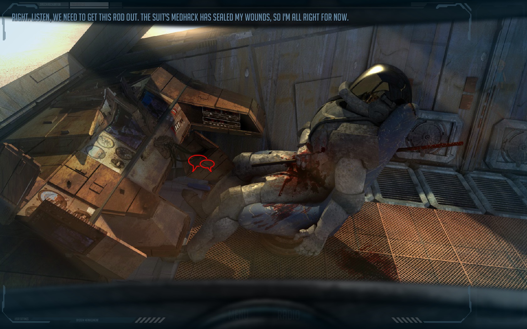 Wir übernehmen die Rolle des Technikers Powell, der nach dem Absturz recht schnell feststellen muss, das sein Kollege Johansen ums Leben kam und sein schnoddriger Captain Novak von einer Metallstange penetriert wurde und dementsprechend Hilfe benötigt.