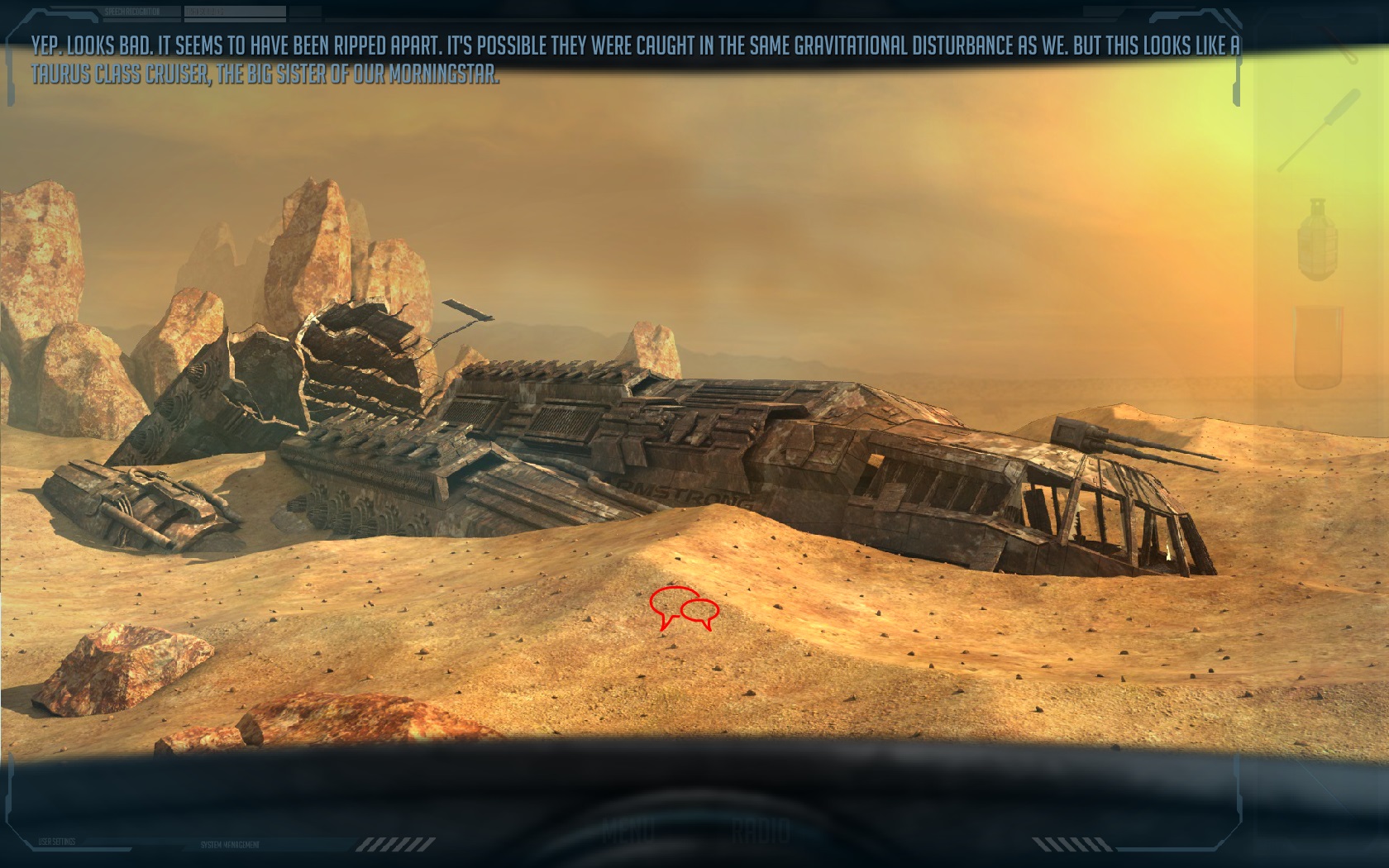 Grafik: Die Renderbilder sehen gut genug aus für ein Indie-Adventure. Gegen Titel wie Perry Rhodan oder Black Mirror III kommen die Screens freilich nicht an, aber wie gesagt: Gut genug sehen sie schon aus. Das größte Problem ist wohl die statische Präsentation. Es gibt eigentlich keine Bewegung innerhalb der Rendersecreens. Selbst der schwerverletzte Novak sitzt in seinem Raumanzug da wie zu Salzsäure erstarrt, was natürlich entsprechend befremdlich wirkt. Kleinere Ausnahmen bestätigen die Regel. Wenn man eine Explosion auslöst oder einem Generator bei der Arbeit betrachtet, kommt natürlich schon etwas Bewegung ins Spiel, aber solche Dinge bleiben leider die Ausnahme.