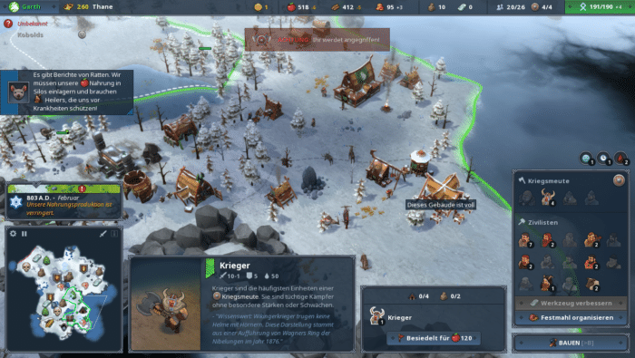Die kampftechnischen Gefahren sind leider nicht das einzige Problem, denn neben Rattenplagen, die eure Lebensmittelvorräte gerne reduzieren, kann der Winter ebenfalls für Knappheiten an Rohstoffen sorgen. Zusätzlich sind Naturkatastrophen wie Erdbeben Teil der Gefahren für eure Siedler. Ein optimales Planen und Vorausschauen ist daher unerlässlich.