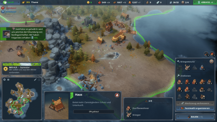 Um gut in das Geschehen hineinzufinden, starte ich erst einmal das freie Spiel, welches mir genügend Instruktionen freigibt, um einen leichten Einstieg zu finden. Vorab darf ich aber frei wählen, welchem Clan ich angehören möchte, was mir zusätzliche Boni beschert. Entsprechend dessen darf ich mit der Auswahl des Hirsch-Clans mehr Rohstoffe zu Beginn verbraten, währenddessen der Bären-Clans seine Krieger gut durch den Winter kommen lässt.