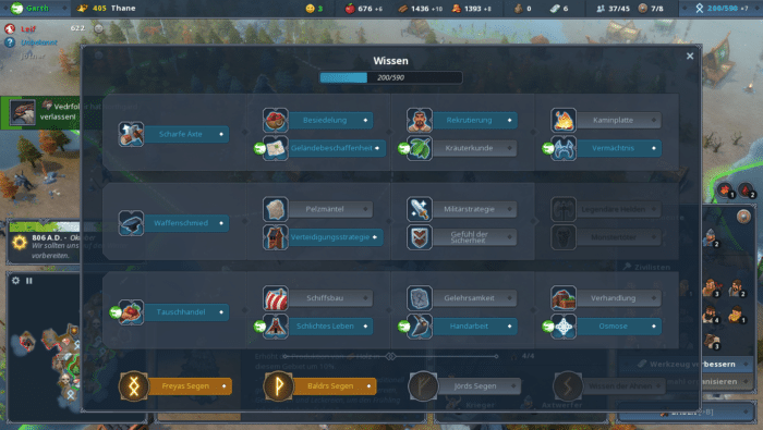 Gleichzeitig könnt ihr mit hinzugewonnenen Wissen die Segen von Freyas, Baldas und Jörgs freischalten, die euch weitere Boni zuteil werden lassen. Freyas beugt beispielsweise einer Hungersnot vor, währenddessen Baldas das Völkchen etwas glücklicher stimmt und somit die Produktion vorantreibt. Damit könnt ihr vielleicht sogar abseits von militärischen Streifzügen die Matches gewinnen.