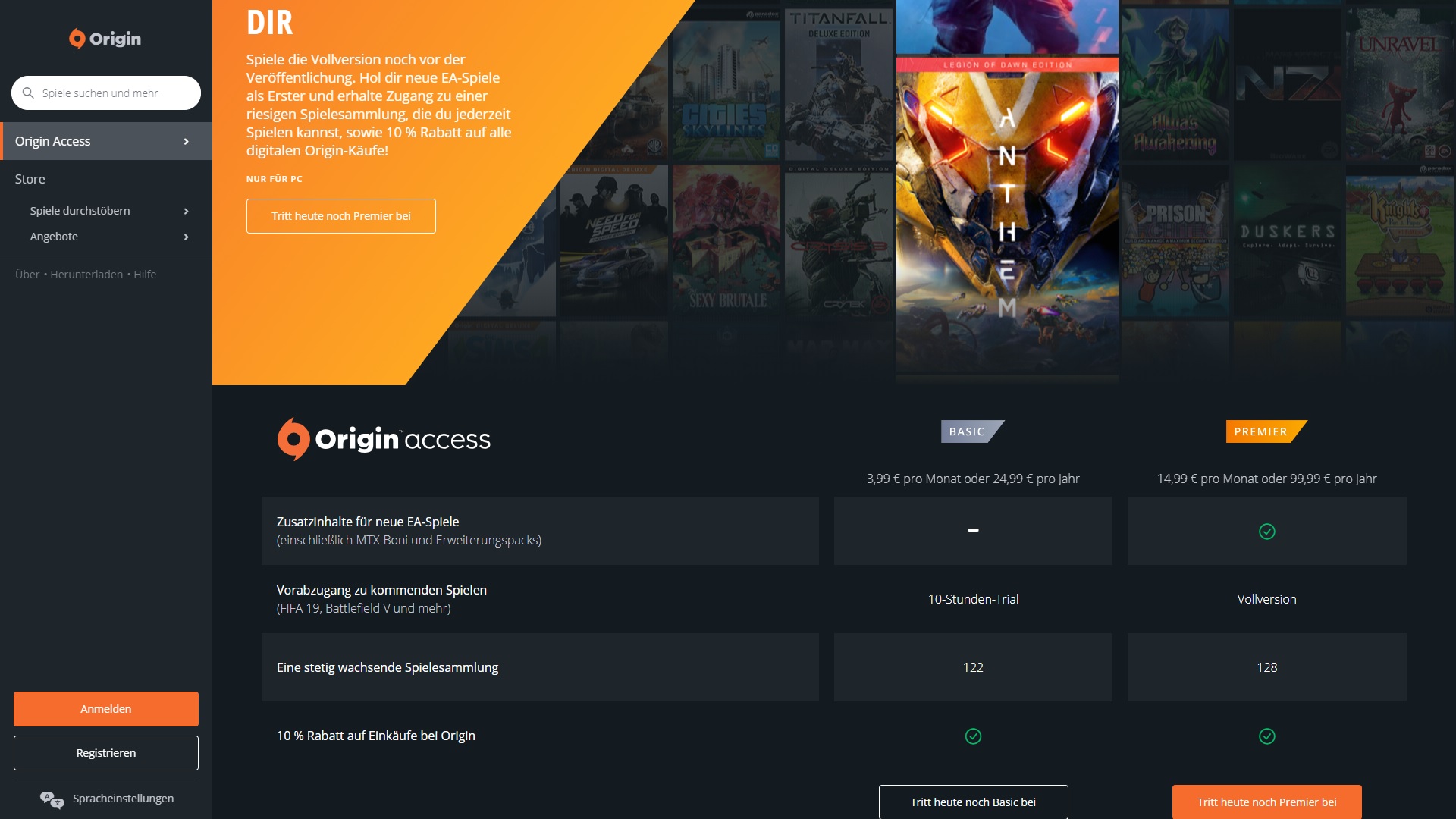 Origin Access Premier, der Premium-Service, welcher von Electronic Arts auf der diesjährigen E3 angekündigt wurde, ist nun endlich für PC verfügbar. Entgegen den Vermutungen ersetzt Premier das bisherige Abo-System nicht, sondern wird parallel dazu angeboten. Für 14,99 Euro monatlich bzw. 99,99 Euro jährlich erhalten Abonnenten bereits fünf Tage vor Veröffentlichung vollständigen Zugriff auf kommende EA-Spiele. Zusätzlich gibt es zum bestehenden Angebot der Vault aktuelle Titel wie Star Wars Battlefront II oder A Way Out. Weiters erhalten Premier Mitglieder Erweiterungen für verfügbare Vault-Spiele kostenlos. Infos zu Origin Access Premier findet ihr (hier), inklusive einem FAQ mit den wichtigsten Fragen und Antworten. Wir sind gespannt, ob sich Premier gegenüber des Basic Abo’s behaupten kann, welches nur etwa ein Viertel kostet und dennoch viele Spiele bietet. Über Pläne, Premier auch für Konsolenspieler anzubieten, ist aktuell noch nichts bekannt.