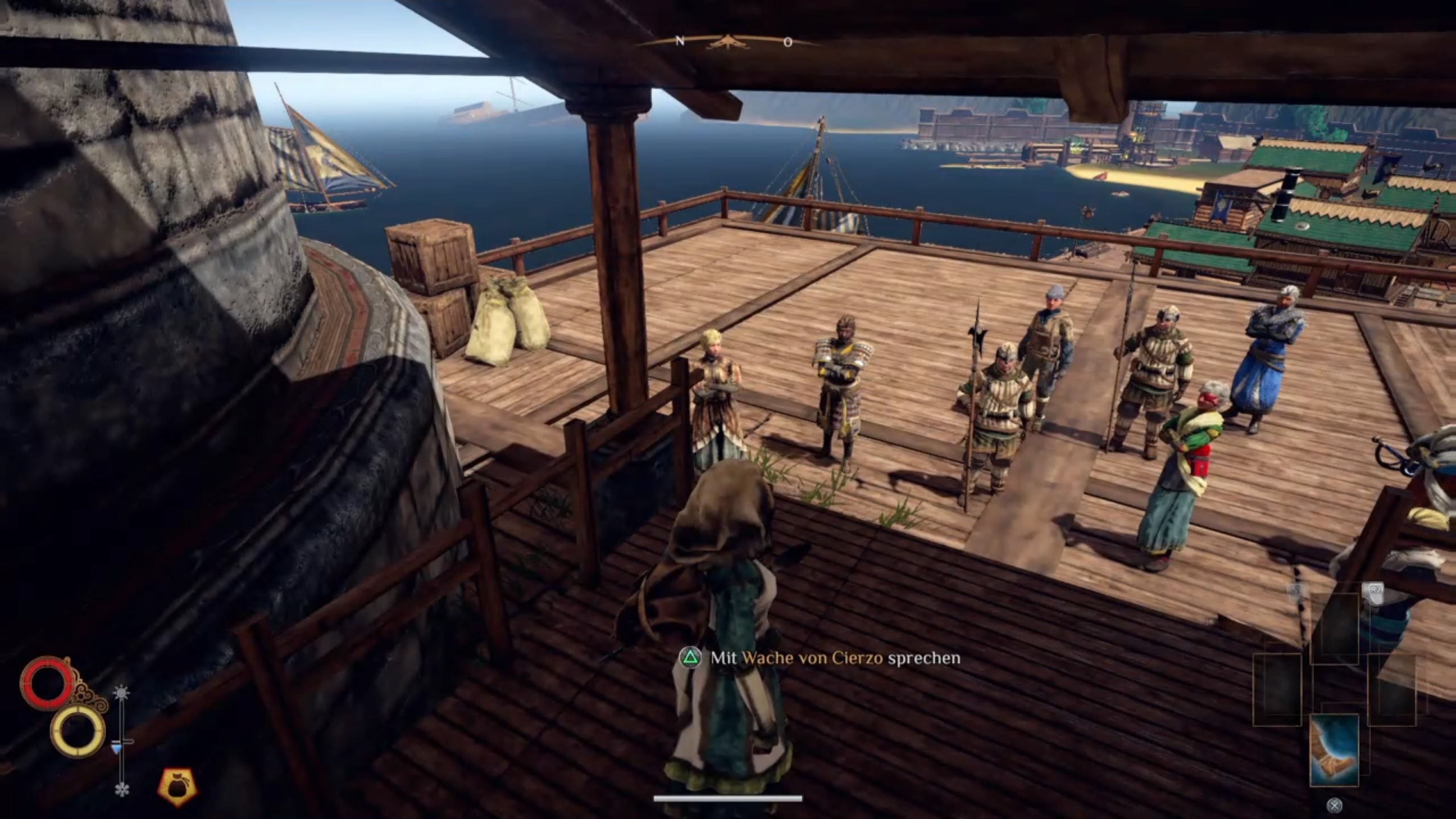 Leider fällt uns hier das erste Mal die eher leblose Spielwelt auf. Natürlich können wir Questgeber und Verkäufer ansprechen. Aber das war es dann auch schon mit den Interaktionsmöglichkeiten. Die vielen NPCs, die in der Spielwelt beheimatet sind, laufen eher rum wie Statisten aus der neuen Walking Dead Staffel und haben auch genauso viel Text. Dazu kommt noch, dass die Tageszeit keinen Einfluss auf die Arbeit oder das Verhalten der NPCs hat. Abends ist es in Cierzo, dem Heimatdorf unseres Helden, nur dunkel.