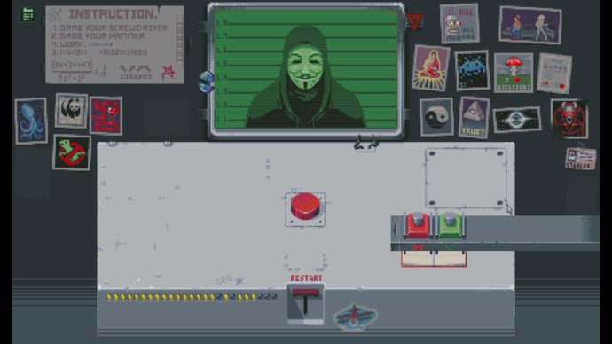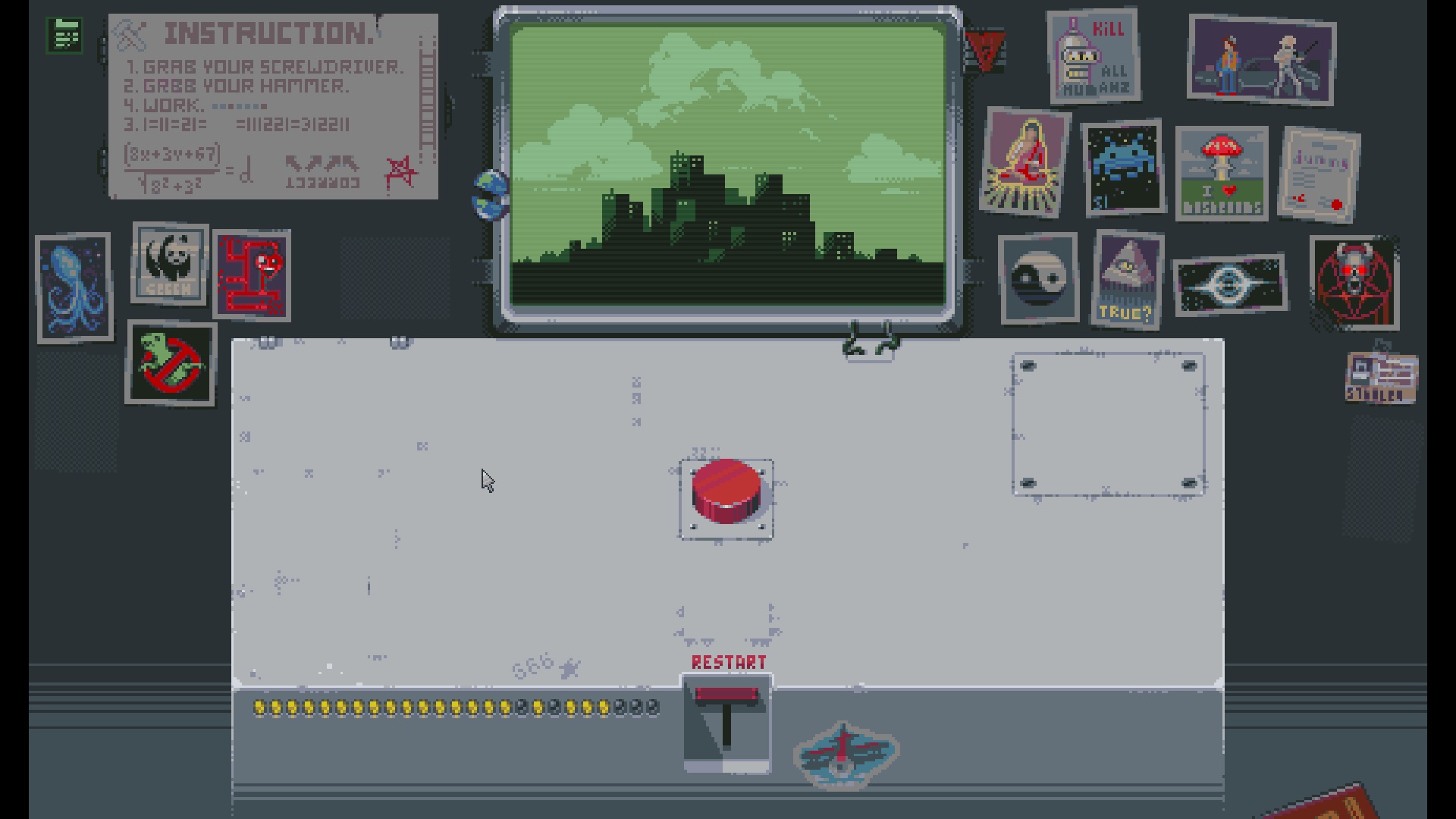 Please, Don’t Touch Anything entpuppt sich als eine Art Rätsel- oder Puzzle-Game. Man spielt quasi sich selbst, der gerade einen Kumpel von der Arbeit abholt, um halt gemeinsam die Freizeit zu verbringen. Bevor es losgeht, verzieht sich der Kumpel (wahrscheinlich geht er aufs Stille Örtchen) und bittet uns die Finger von seiner Arbeitskonsole zu lassen. Jene Konsole reizt mit einem großen roten Knopf, der vor einem Monitor platziert ist, welcher eine Großstadt anzeigt. Was passiert bloß, wenn man den Knopf drückt? Oder sollte man nicht doch lieber warten, bis der Kumpel sein Geschäft erledigt hat? Egal wie ihr euch entscheidet, im Endeffekt geht es sowieso darum alle 25 Lösungsmöglichkeiten dieser Situation herauszufinden – und ja, das brave warten auf den Freund ist eine der Lösungen. Die anderen Lösungen sind hingegen an teils abartig komplexe Knopf- und Codepuzzle geknüpft. Man bekommt vom Spiel zwar ein paar Hinweise diese Rätsel zu lösen, doch sind diese zum Teil sehr schwer zu verstehen und manchmal auch sehr fies versteckt. Manchmal wird das Spiel auch absurd träge, so gibt es z.B. ein paar Rätsel, wo man einen Counter von 0 in den dreistelligen Bereich hochdrücken muss. Da ist man dann mehrere Minuten damit beschäftigt stupide herumzuklicken. Das hat dann echt nichts mehr mit Nachdenken oder Rätsel lösen zu tun, sondern ist pure Schikane! Nur die wenigsten werden die Mühe auf sich nehmen alle 25 Lösungsmöglichkeiten aufzudecken. Und ohne Komplettlösung geht das sowieso nicht.
