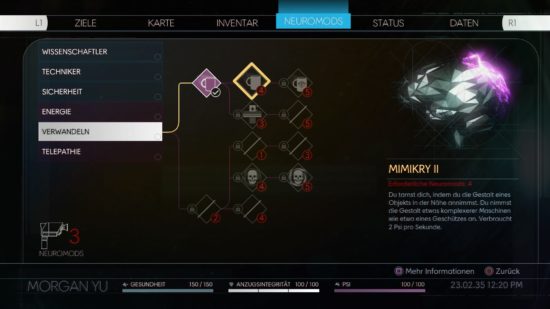 Nach und nach könnt ihr euren Charakter mit neuen Fähigkeiten ausstatten. Dafür müsst ihr zunächst aber einmal genügend Neuromods gesammelt haben.