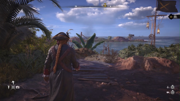 Leider geht es weiter abwärts und die nächste negative Welle schwappt über uns her. Denn jetzt schauen wir uns einmal einige Features an, die wir nicht bekommen und stellenweise wirklich vermissen. Unser Pirat kann nicht springen und auch nicht schwimmen. Auch wenn wir entspannt gehen wollen – sobald eine Treppe kommt, rennt er diese entweder rauf oder runter. Hier lässt sich die Geschwindigkeit nicht regeln. Die Third-Person-Kamera bleibt ziemlich nah am Charakter dran. Ich habe aktuell noch keine Möglichkeit gefunden, diese zu ändern, wenn mir die Übersicht fehlt. Auch können wir nicht an Land kämpfen. Wir tragen mehrere Waffen mit uns herum, die jedoch nur kosmetischer Natur sind. Und was mich wirklich verwundert hat, wenn wir mit unserem Piraten bis zum Bauch oder teilweise sogar bis zu Brust ins Wasser gehen: sobald wir wieder aus dem Wasser herauskommen, ist unsere Kleidung weder nass noch tropft Wasser an uns herunter, welches den Sand unter uns feucht werden lässt. Und das verwundert mich deswegen, da man solche Details schon 2013 in Assassins Creed Black Flag sehen konnte. Aber die Entwickler dachten sich wohl, schwimmen ist sowieso nicht vorgesehen, also müssen wir da auch nichts animieren. Echt schade!