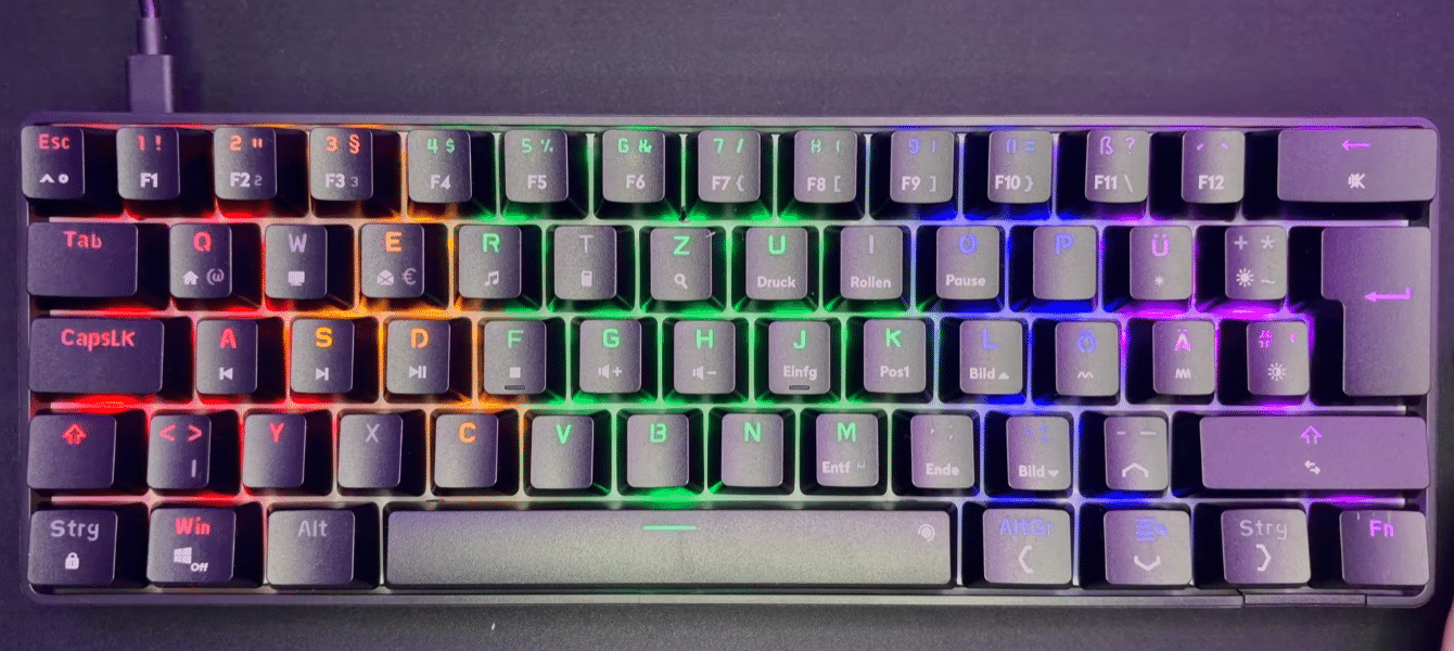 Ich persönlich bin ein großer Fan dieses Formfaktors und finde das Design sehr ansprechend. Die Tasten selbst liegen nicht oben auf, sondern sind in das Gehäuse der Tastatur eingebettet und werden vom Rand des Tastaturgehäuses umschlossen. Dadurch liegt auch die RGB Beleuchtung etwas tiefer im Gehäuse und springt einem nicht direkt ins Gesicht. Sie ist etwas dezenter, aber nicht weniger präsent. Mit den Tasten „FN“ und „Raute“ lassen sich diverse Modi auswählen. Ich lasse hier im Hintergrund mal ein paar Modi durchlaufen. (Eventuelles flackern der Beleuchtung liegt an der Kamera und nicht an der Beleuchtung selbst). Mit den Tasten „FN“ und „Plus“ oder „Ü“ lassen sich dann noch die Helligkeit einstellen oder gar komplett ausschalten.