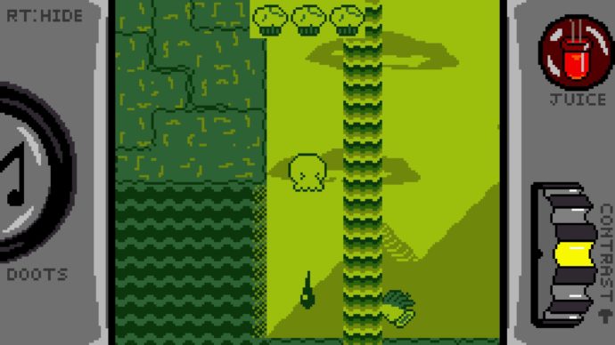Einerseits gefällt Squidlit durch eine überraschend authentische Game Boy-Grafik, aber andererseits kann es das Spiel auch in optischer Hinsicht nicht mit den alten Klassikern wie Kirby’s Dreamland aufnehmen. Es gefällt mir, dass das Spiel Farbwahl und Screenformat der Original-Hardware gekonnt umsetzt. Tatsächlich bin ich davon überzeugt, dass das Spiel auf eine GB-Cartridge passen würde und direkt auf dem Game Boy gezockt werden könnte. Großes Kompliment dafür an die Entwickler. Allerdings ist die Grafikqualität selbst für GB-Verhältnisse nichts was vom Hocker reißt. Es wirkt wie ein sehr früher GB-Platformer, der einem Nintendo-Titel nicht das Wasser reichen kann. Und das wäre auch völlig in Ordnung, wenn Squidlit nur nicht so derbe auf der Kirby’s Dreamland-Masche pochen würde. Kirby war seinerzeit nunmal ein waschechter Grafikblender, also sollte man auch veruchen dessen Grafikpomp zu emulieren, wenn man schon so derbe an dieser spezifischen Nostalgie-Wurzel zerrt.