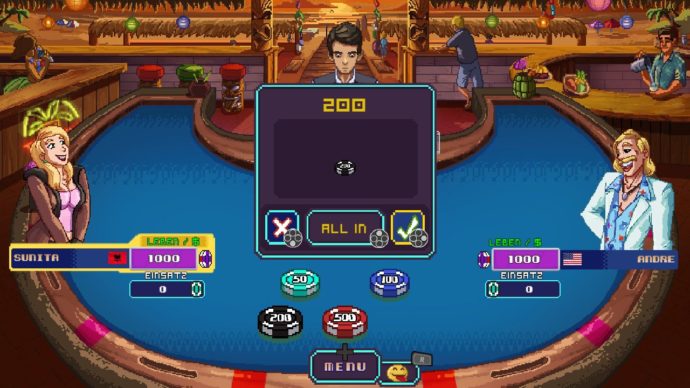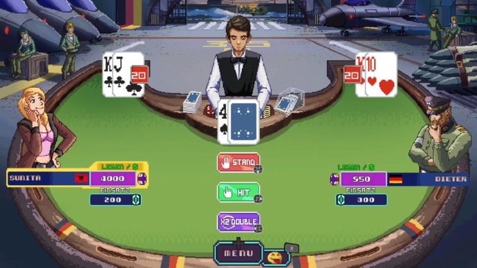 Das dürfte es für diesen Hauptmodus wohl auch schon gewesen sein: Ihr zieht über den Globus vom Deutschen Dieter, dessen Heimspielort ein militärisches Flughafen-Areal zu sein scheint (?) über den südafrikanischen, bewaffneten Warlord Greg (?!) bis hin zu einem australischen Surferboy und spielt Blackjack. Nur wenige stupide Stereotypen später werdet ihr feststellen, dass wirkliches Können nur selten gefragt ist. Dies liegt nur zum Teil an der Natur des Spiels, ein Glücksspiel zu sein. Zum anderen liegt dies auch in der relativ dummen Natur eurer Gegenspieler begründet, die nur eingeschränkt taktisch spielen und ihren Einsatz etwa kaum der Spielsituation in Sachen Chips, die beide Spieler auf dem Konto haben, entsprechend anpassen. Wer es ganz gemütlich haben will, setzt einfach in der ersten Runde alle 1.000 Chips, hofft auf einen Gewinn und – sollte dieser eintreten – setzt fortan so wenig wie möglich, um die nunmehr 2.000 Chips konstant zu halten. In der Regel reicht dieses Prinzip zum Sieg – und solltet ihr direkt in der ersten Runde pleite gehen, sei‘s drum: Unendlichen Continues sei Dank könnt ihr es ja gleich noch mal versuchen!