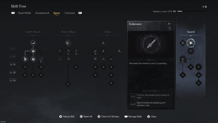 Insgesamt gibt es vier unterschiedliche Skill-Trees. Jede der drei Waffenarten besitzt einen eigenen Skillbaum, zusätzlich gibt es noch universale Fähigkeiten, mit denen man etwa schneller Spirit-Punkte auflädt, die im Kampf für Spezialattacken eingesetzt werden. Man sollte sich den Gefallen tun und sich früh auf eine Waffengattung festlegen, da Skillpunkte einigermaßen spärlich rausgegeben werden. Ich habe mich für den Speer entschieden, der eine gute Reichweite hat, netten Schaden macht und dennoch schnell zu handeln ist. Mit den entsprechenden Skills, bekommt man beispielsweise eine neue Kampf-Haltung, die nach einer Kombokette aktiviert wird und für einen abgesteckten Zeitraum mehr Schaden macht und schnellere Ausweichmanöver erlaubt. Auch die freischaltbaren Spezialattacken sind ein schöner Anreiz. Wer irgendwann merkt, die ausgewählte Waffe ist nicht das richtige, kann übrigens jederzeit mit einem speziellen Item umskillen.