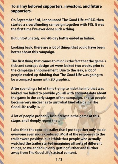 Vor einigen Wochen meldete sich der japanische Game Designer Swery 65 nach einigen Monaten der medialen Abstinenz zurück und startete auf der Crowdfunding-Plattform Fig eine Kampagne zu The Good Life, einem neuen, sehr eigenwilligen Adventure. Die Kampagne wurde nun erfolgslos beendet. In einem umfangreichen Schreiben (siehe unten) nimmt Swery darauf nun Bezug und bedankt sich bei allen Unterstützern. The Good Life soll aber nach wie vor realisiert werden. Im kommenden Jahr will man es daher auf Kickstarter probieren.