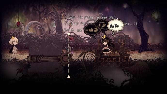 Spielerisch hat man es in The Liar Princess and the Blind Prince mit einem sogenannten Puzzle Plattformer zu tun. Das heißt über Hindernisse hüpfen und nebenbei kleinere Knobeleien lösen. Ähnlich wie bei Ico muss man den Prinz bei der Hand nehmen, später gibt man ihm Befehle zum Aufheben. Manchmal sind Denkaufgaben gefragt, aber auch diese halten sich in Grenzen und verursachen keine Gehirnknoten. Zudem kann sich die Prinzessin jederzeit wieder in einen Wolf verwandeln, um sich gegen angreifendes Getier zu wehren.