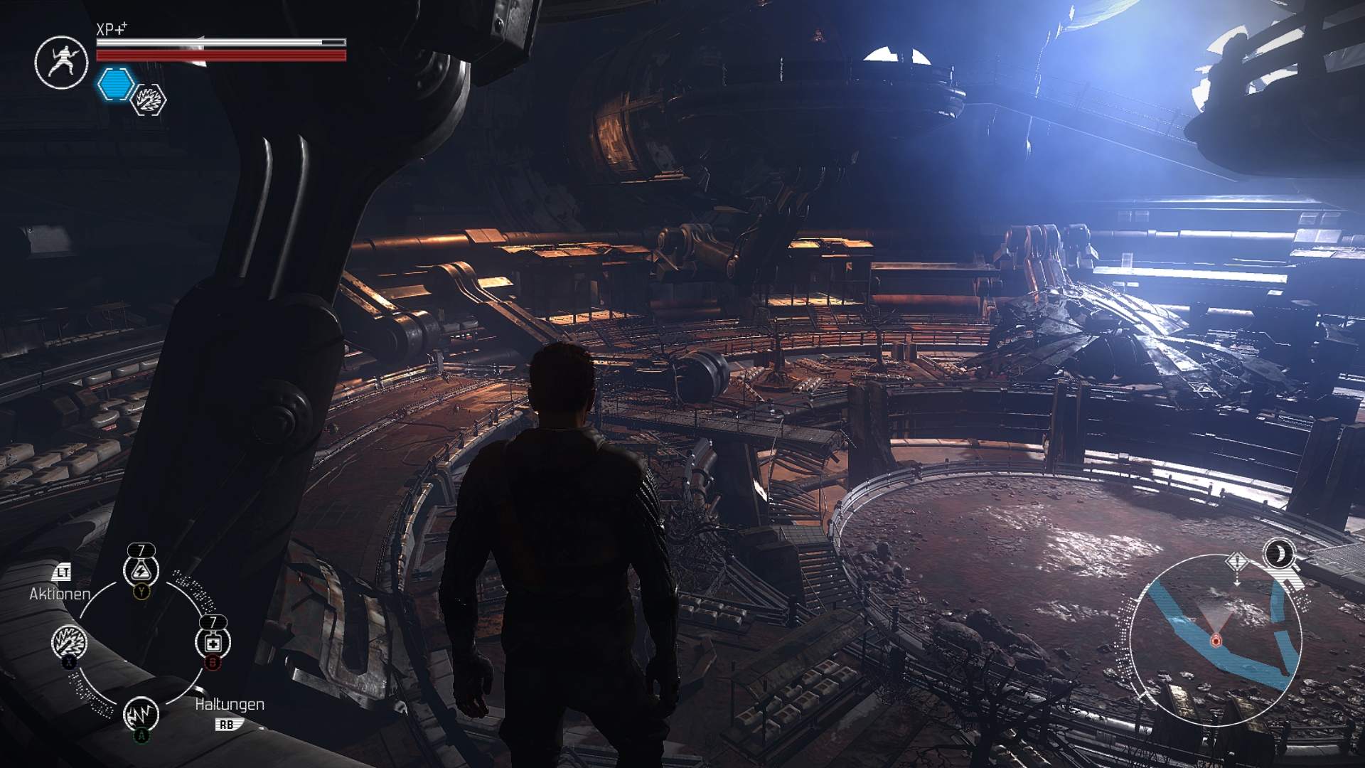 Wie bereits berichtet, gestaltet sich die Steuerung etwas träge sowie schwammig. Zumindest wurden alle Befehle vernünftig auf dem Controllerlayout verteilt, was für eine recht kurze Eingewöhnung sorgt. Navigiert wird hierbei mit dem linken Analogstick, der rechte steuert die Kamera. Leichter, schwerer Angriff sowie die Ausweichrolle wurden auf den Aktionstasten untergebracht. Sekundärfeuer, alle Technomancer-Fähigkeiten und der Wechsel des Kampfstils werden mit den Schultertasten ausgeführt. Abgesehen von einer gewissen Trägheit geht das Abenteuer jedoch gut von der Hand. Wir konnten die Xbox One-Fassung testen, doch auch PC-Spielern würden wir zu einem Controller als Eingabegerät raten.