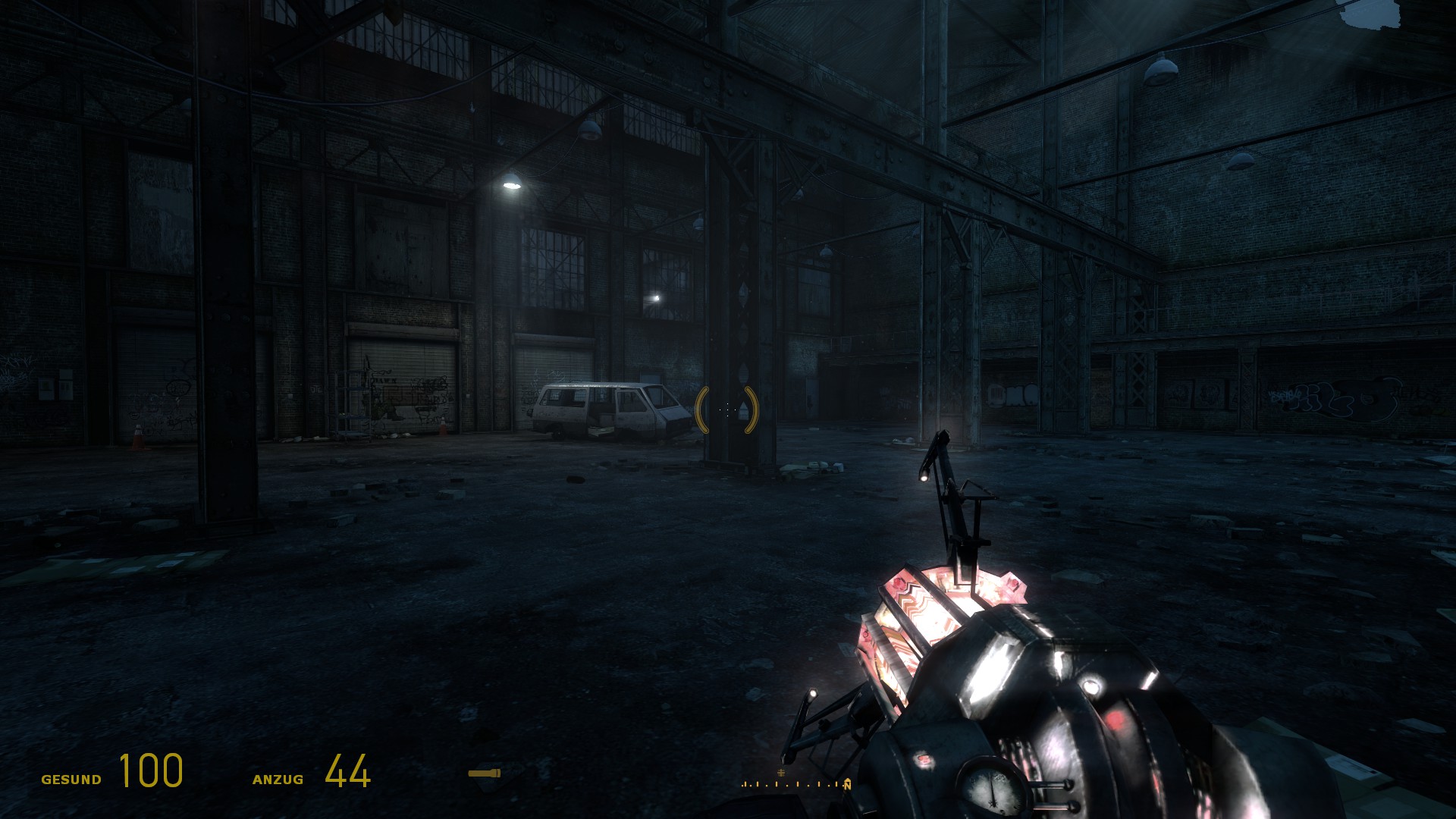 Abseits der Concussion Gun gibt es freilich noch eine solide Auswahl an Half-Life 2-Schießeisen. Die ikonische Brechstange darf freilich auf keinen Fall fehlen. Darüber hinaus gibt es noch die 9mm-Pistole, den .357 Magnum-Revolver, die Schrotflinte, die SMG, den RPG-Raketenwerfer, Granaten, die Armbrust und das Impulsgewehr. Eine solide Auswahl, die jedoch nicht gegen die mächtige Concussion Gun anstinken kann. Lediglich zu Beginn muss man auf Brechstange und 9mm zurückgreifen, während für das finale Gefecht noch der Raketenwerfer relevant wird, weil man es dort mit Stridern (die Tripods des Half-Life-Universums) aufnehmen muss, welche nur gegen Raketen-Geschosse empfindlich reagieren. Letzteres ist leider auch der große Knackpunkt in der finalen Levelkarte, denn die notwendige Munition für den Raketenwerfer ist begrenzt und wurde zudem auf den Dächern der umliegenden Gebäude verteilt. Dies zwingt den Spieler einerseits dazu genau zu zielen und andererseits den nervigen Super Mario/Concussion Gun-Sprung in hektischen Situationen zu nutzen, um auf die Dächer zu gelangen. Als entsprechend heikel und intensiv entpuppt sich dann auch das letzte Gefecht, wobei es aber auch eine geheime Alternativ-Methode gibt, die lästigen Strider zu vernichten.