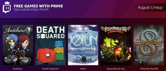 Auch im August werden Besitzer von Amazon Prime, sofern sie ihr Konto mit einem Twitch-Account verbunden haben, wieder ein paar kostenlose PC-Spiele erhalten. Mit dabei sind diesmal Antihero, Steamworld Dig, Death Squared, Jotun in der Valhalla Edition und ein Wizardry Bundle. Die Spiele werden ab dem 01. August 2018 für rund einen Monat verfügbar sein und müssen über die Twitch TV Desktop App geladen werden.
