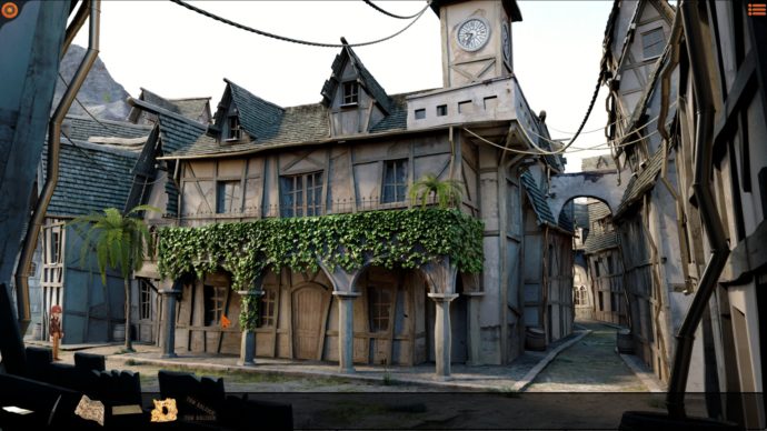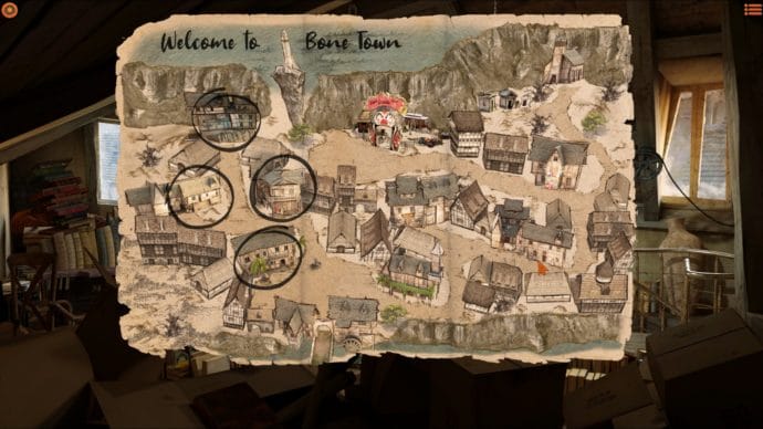 Willy Morgan and The Curse of Bone Town bietet hierbei die gängigen Komfort-Optionen in Form einer Hotspotanzeige und dem Doppelklick, um Durchgänge in andere Screens abzukürzen. Ferner bekommt man relativ Früh im Spiel auch eine Stadtkarte von Bone Town, welche man nutzen kann um größere Wegstrecken bequem abzukürzen. Hätte man jetzt noch eine Rennfunktion per Doppelklick eingebaut, dann wäre der Komfort-Faktor perfekt ausgefallen. Das was aktuell in dieser Hinsicht geboten wird, kann man aber dennoch als „sehr gut“ bezeichnen, da Willy Morgan noch eine kleine aber feine Sonderfunktion bietet, die ich in dieser Form noch nicht gesehen habe. Mithilfe des Mausrads kann man nämlich die Inventarleiste nach eigenem Wunsch ein- oder ausblenden. Somit kann man die Renderscreens in vollem Umfang genießen, ohne dass man das Inventar umständlich aufrufen muss, sobald es benötigt wird. Ein cleverer Kniff, der für mich beweist, dass sich die Entwickler Gedanken gemacht haben, wie man ein Genre verfeinern kann, welches ja eigentlich schon in felsenfesten Gameplay-Schablonen verankert ist und daher derartige Gedanken gar nicht mal voraussetzt. Schön zu sehen, dass die Entwickler mit Motivation an die Sache herangegangen sind.