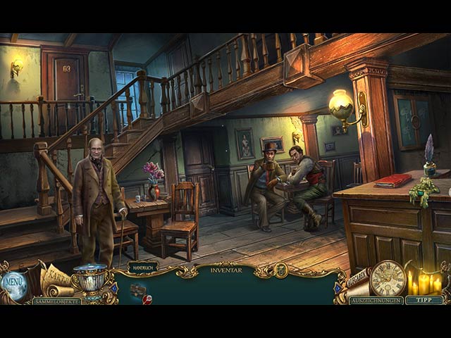 Mit Haunted Hotel – Zum Tode verurteilt gibt es sofort etwas für die Augen, denn bei dem benannten Titel handelt es sich um eines der grafisch anspruchsvolleren Wimmelbilder. Und auch die Bezeichnung Wimmelbild wird dem Spiel schnell zu Eigen. Schon binnen weniger Sekunden erschließt ihr den ersten Bereich, in dem ihr Ausschau nach gewissen Gegenständen halten müsst. Und wieder heißt es wie so oft, alles genau abzusuchen und jedes gefordertes Objekt per Klick ins eigene Inventar zu verfrachten. Ist alles von eurer Liste gestrichen, bekommt ihr einen besonderen Gegenstand zur Verfügung gestellt, der an anderer Stelle dringend benötigt wird. Ist das Bild aber zu unübersichtlich, könnt ihr mittels des Tipp-Buttons, das begehrte Objekt einkreisen lassen.