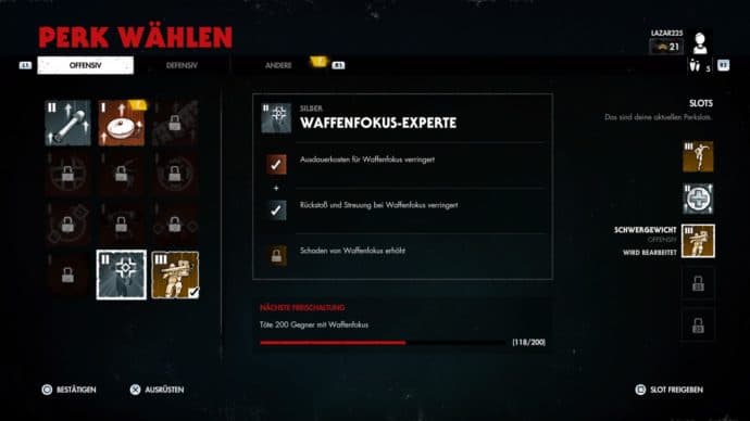 Zum Start (DLCs und Season Pass dürften dies noch ändern) stehen vier unterschiedliche Figuren zur Auswahl, mit denen man auf Zombie-Jagd geht. Die Charakterisierung der Figuren bleibt innerhalb der Handlung ziemlich oberflächlich, sodass ich mich während meiner ganzen Spielzeit nicht sonderlich mit meinem Alter Ego anfreunden konnte. Immerhin kann man in Hinblick auf die Skills etwas mehr Individualität ins Geschehen bringen und die Spielfigur der eigenen Spielweise anpassen. Zur Verfügung stehen jede Menge passive und aktive Perks. Will man mehr Schaden anrichten oder doch lieber selbst etwas widerstandsfähiger werden? Auch kann man spezielle Fähigkeiten, wie etwa einen elektrisch aufgeladenen Faustschlag und Zeitlupe freischalten und nach und nach verbessern. Gleiches gilt für die Waffen, die sich allesamt upgraden lassen, sodass sie mehr Schaden anrichten, mehr Munition fassen usw.