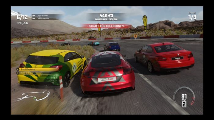Wer auf die Tour wechselt, wird verschiedene Veranstaltungen vorfinden, die aber nur eingeschränkt verfügbar sind. Das heißt, langsam vorarbeiten und beständig Siege einfahren. Doch bieten die Touren weit aus mehr als die gepflegten Meisterschaften, bei denen es oftmals gilt, unter den ersten drei Platzierungen zu gelangen. Weitere Forderungen zeichnen sich darin aus, unter einer gewissen Zeit die Ziellinie zu überqueren, ein Kurvenfahrduell zu dominieren, oder in eine Kurve zu sliden. Mit der Vollbringung der geforderten Ziele werden immer mehr Touren eröffnet und dadurch Klassen begehbar. Gleichzeitig zieht aber auch die Schwierigkeit an und die Wagen schränken sich auf bestimmte Karossen ein. Beispielsweise wird es euch nicht mehr ermöglicht, außerhalb der Amateurliga, mit jenen Autos die asphaltierten Bahnen entlangzuziehen. Selbstverständlich bedeutet dies auch, die Stärken und Schwächen der neuen Klassen auszutesten und neue Favoriten herauszukristallisieren. Durch die verschiedenen Werte in Beschleunigung, Tempo, Driften und Handing zeichnet sich die Steuerung für jeden Wagen individuell ab. Die verschiedenen Autos sind aber allesamt engen Straßen und unterschiedlichen Lagen ausgeliefert. Wer nicht zeitig auf die Bremse tritt, haut mit seiner Seite gegen Zäune oder Leitplanken. Doch neben dem interessanten Schadensmodell, werden verschuldete Fahrfehler auch bestraft. Für das Schneiden von Kurven oder die Kollision mit Mitstreitern sowie einigen Umgebungsobjekten, gibt es Verwarnungen sowie Abzug anteiliger Punkte. Gerade die Strafen sind aber bitter und verlangsamen euren erwählten Wagen, was die restlichen Teilnehmer sofort versuchen auszunutzen. Eine Rückspulfunktion, wie sie aus Forza bekannt ist, lässt sich jedoch vermissen, sodass immer höchste Präzision beim Fahren erforderlich ist.